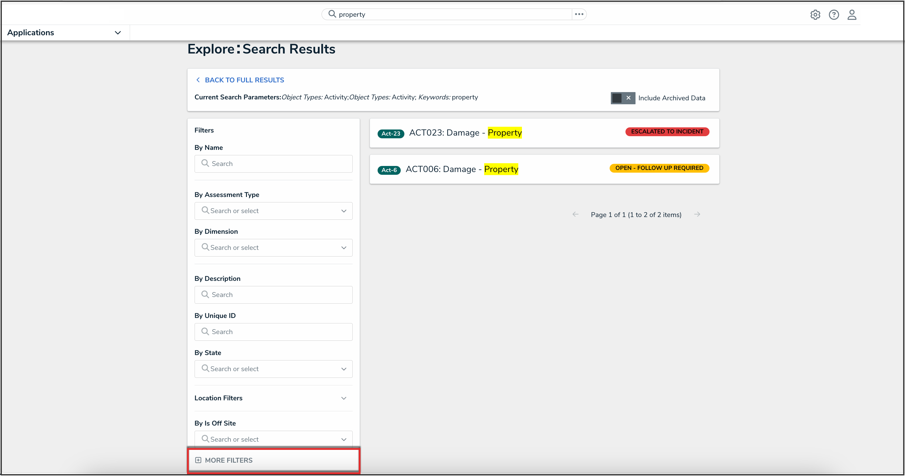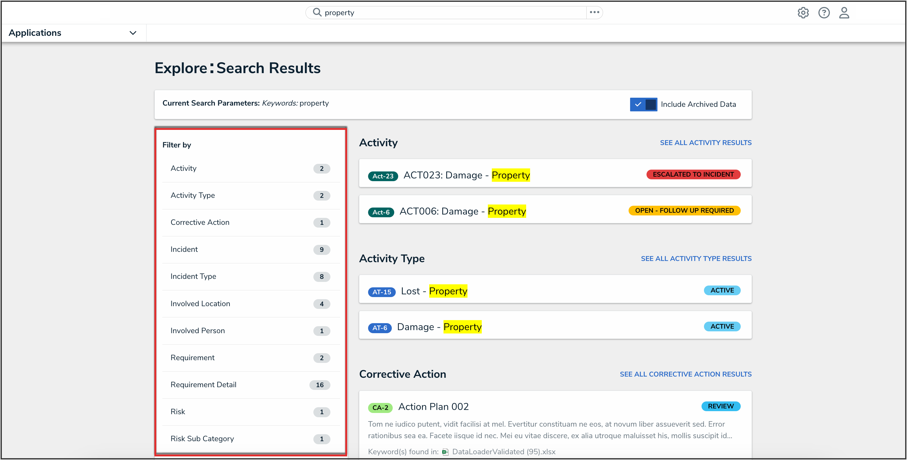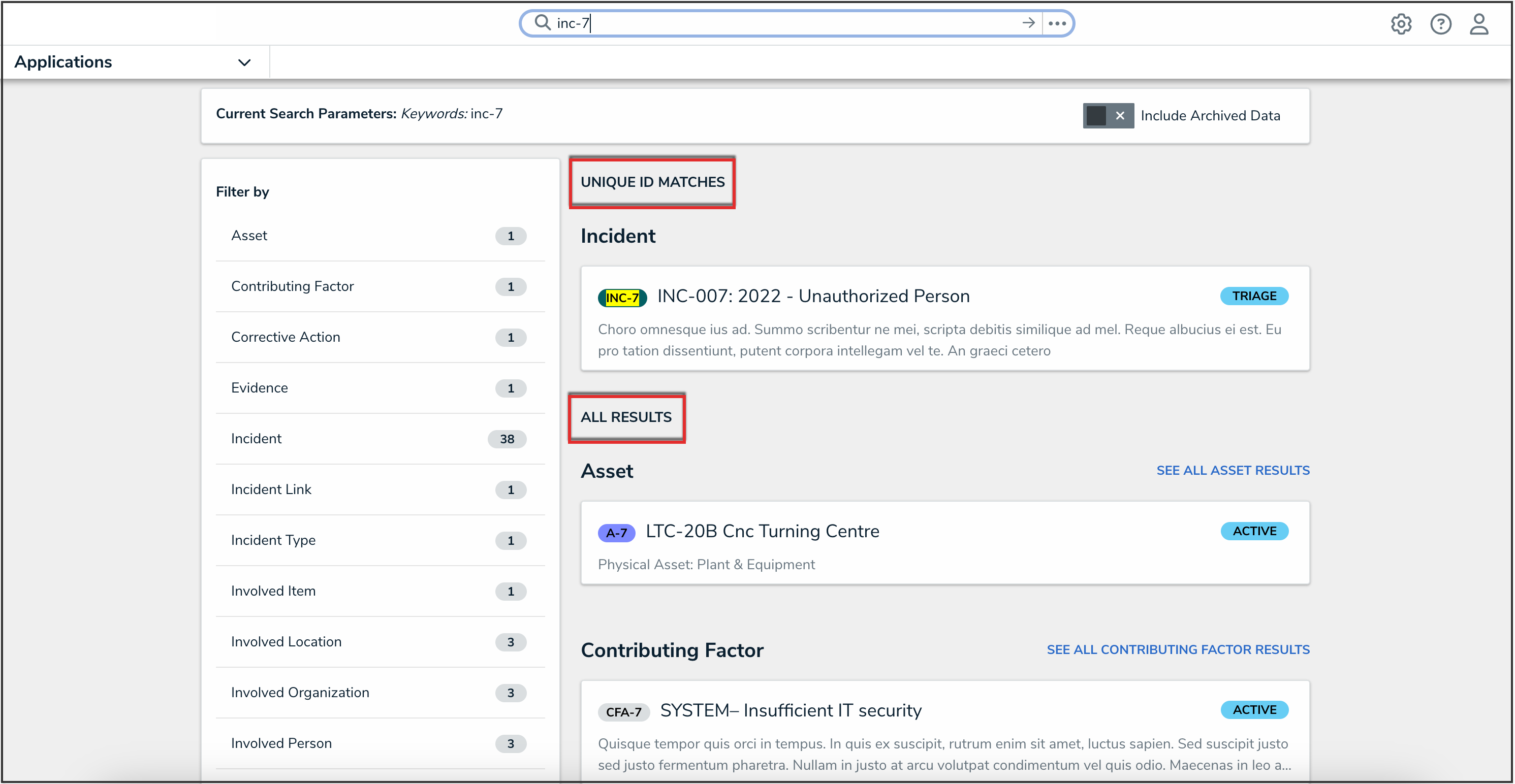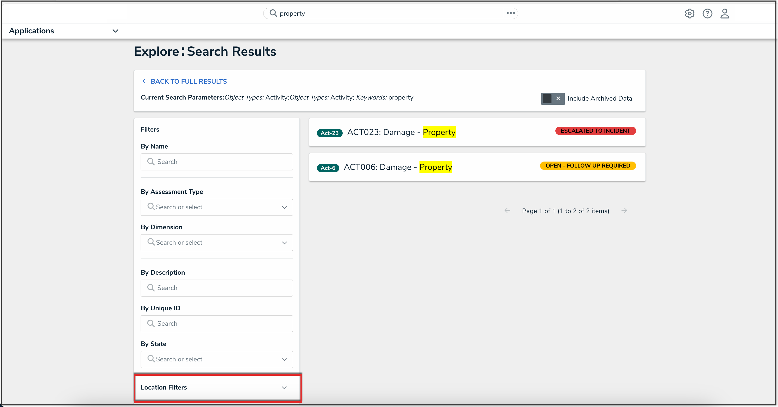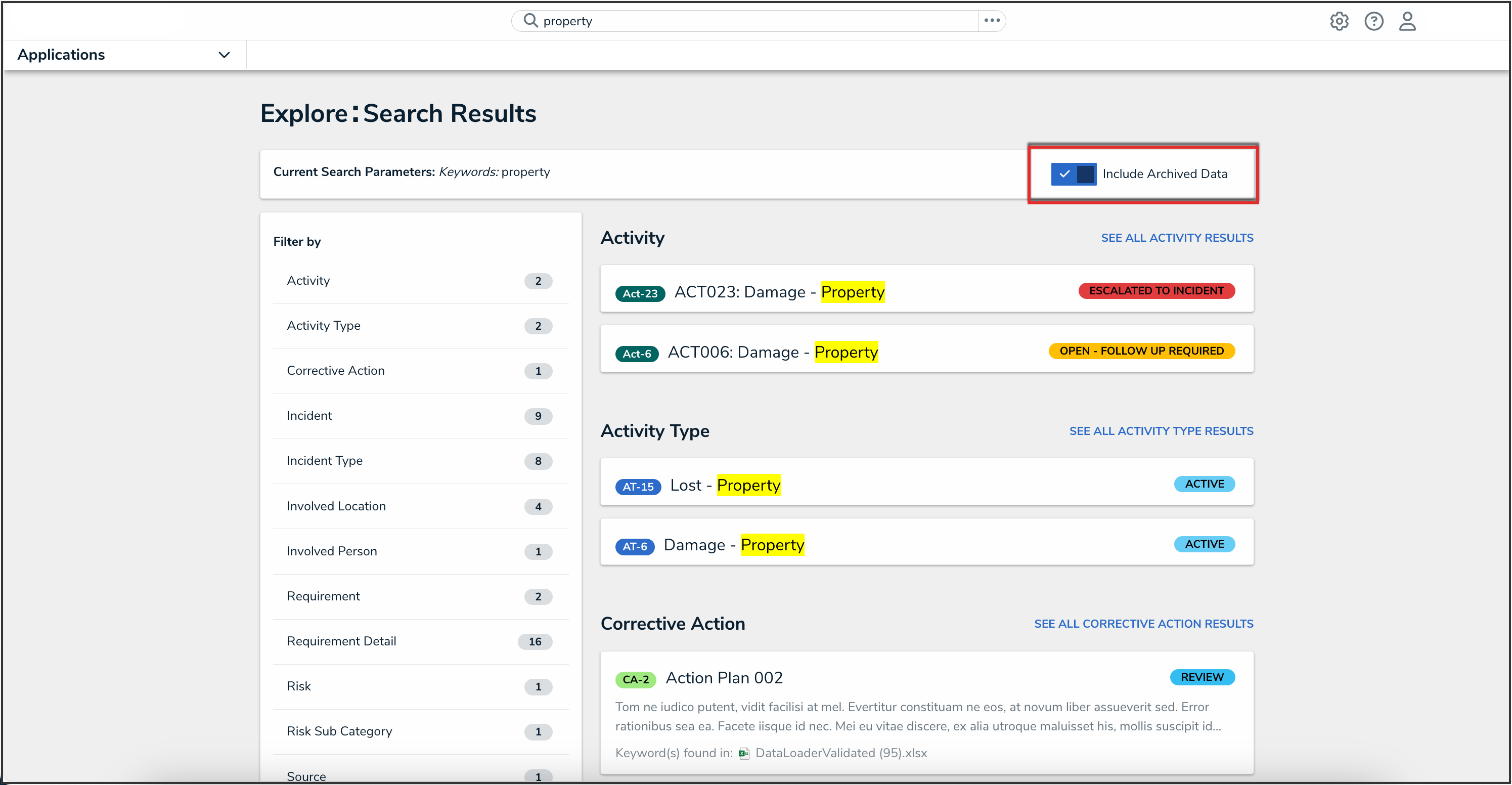 - To include archived data in the search results, click the Include Archived Data toggle to turn it on. If this option is not visible, an administrator has disabled this option for your role.