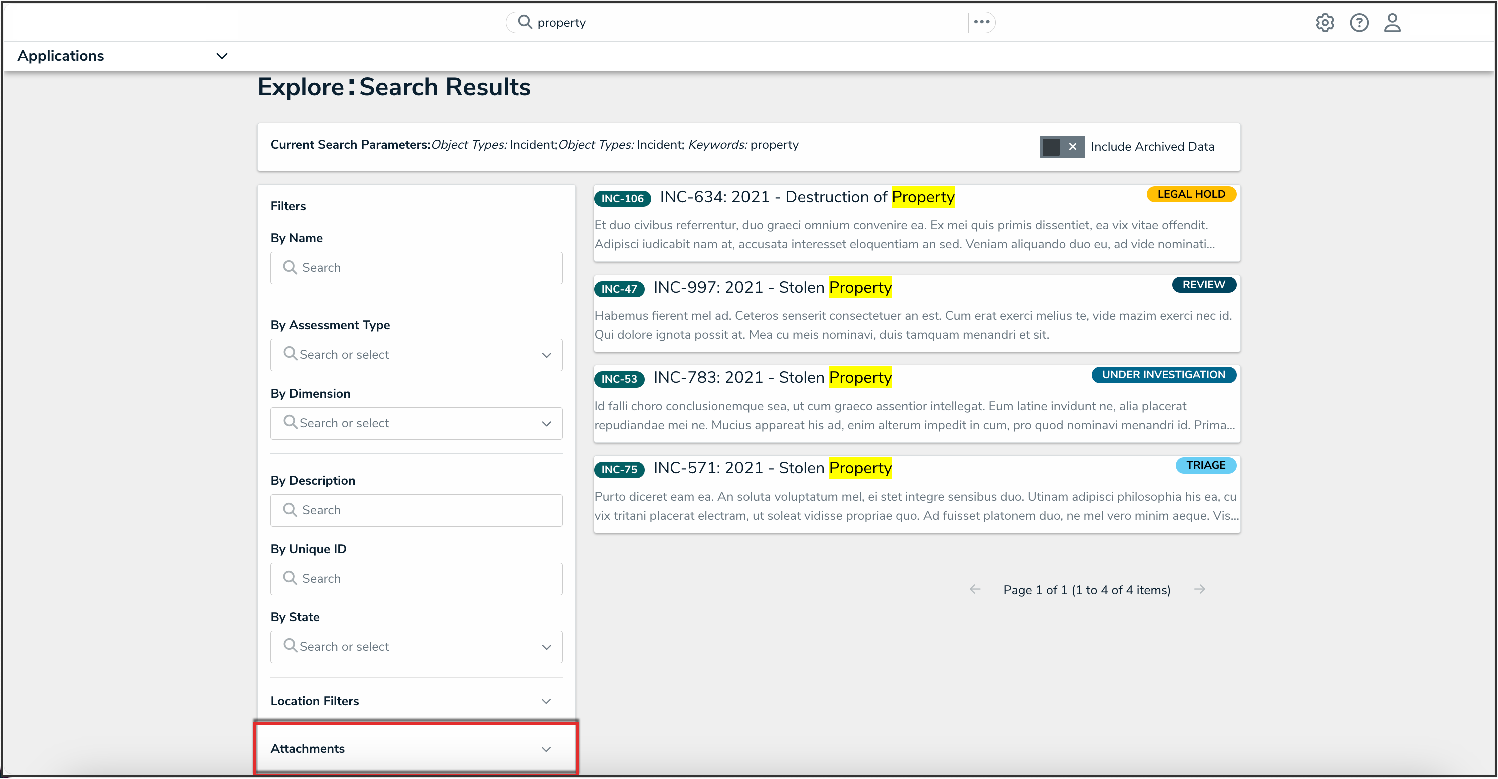 - Click Attachments to expand the filters and search for documents uploaded to objects or assessments through an attachment field. Filters are named after the attachment field and include the Keyword Search (for searching by keywords in the file name or within the document) or By Attachment Upload Date filters. For more detailed information on attachment searches, including a list of supported file types, see the Attachment Searches article.