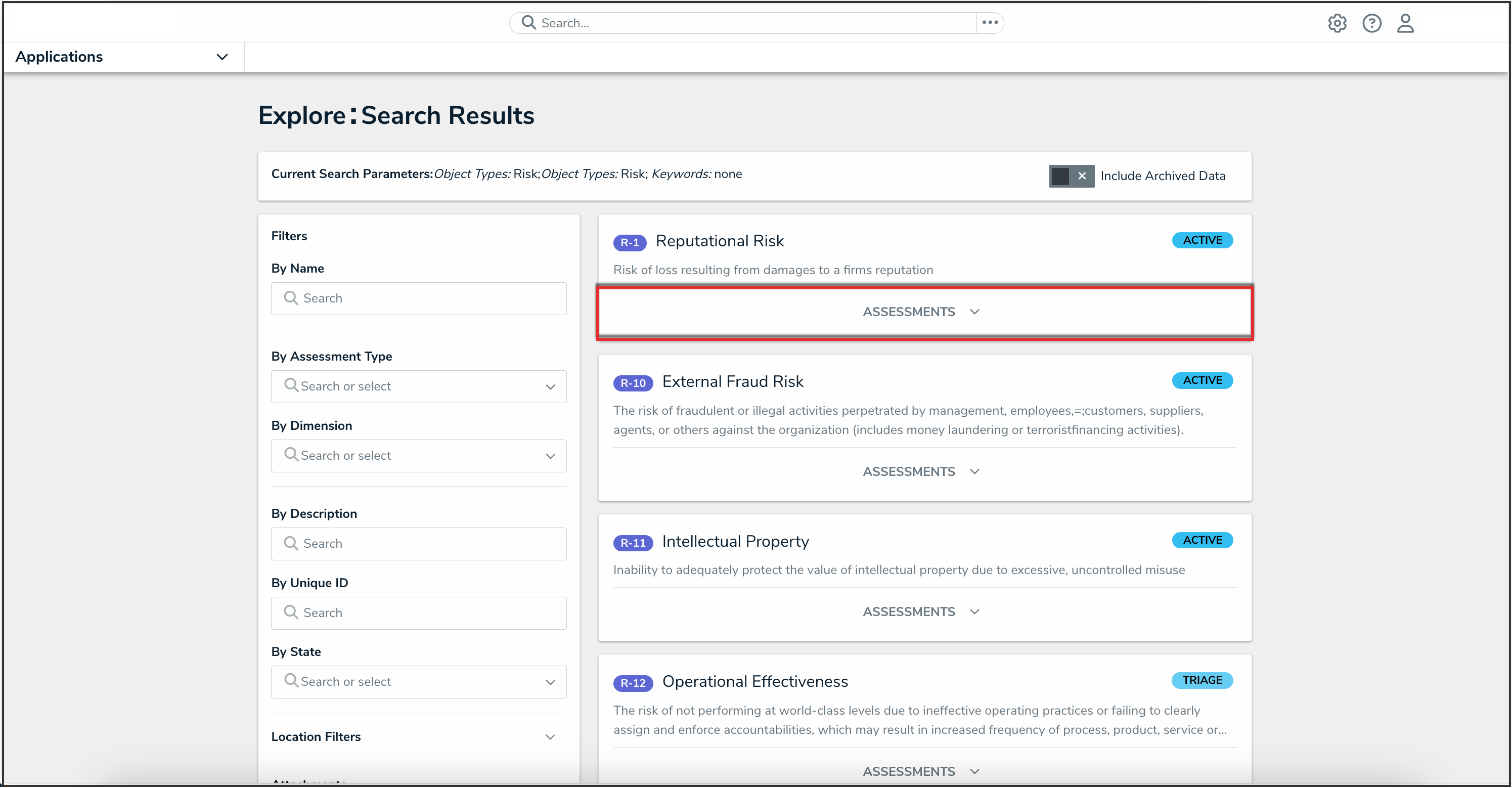 Note: If an object has not been previously assessed, it will not have any instances, and the Assessments button will be hidden by default. |