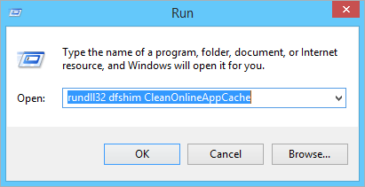 Type or paste rundll32 dfshim CleanOnlineAppCache in the the Run dialog.