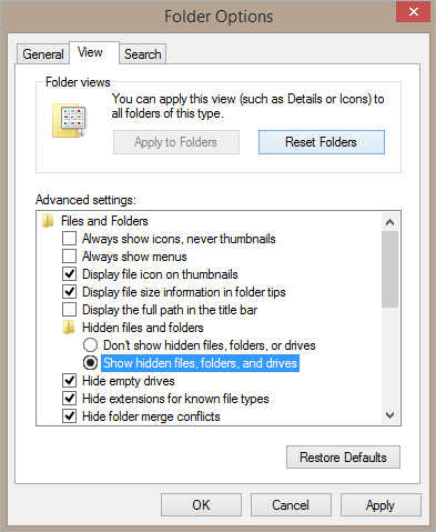Under Advanced settings, select the Show hidden files, folders, and drives radio button.