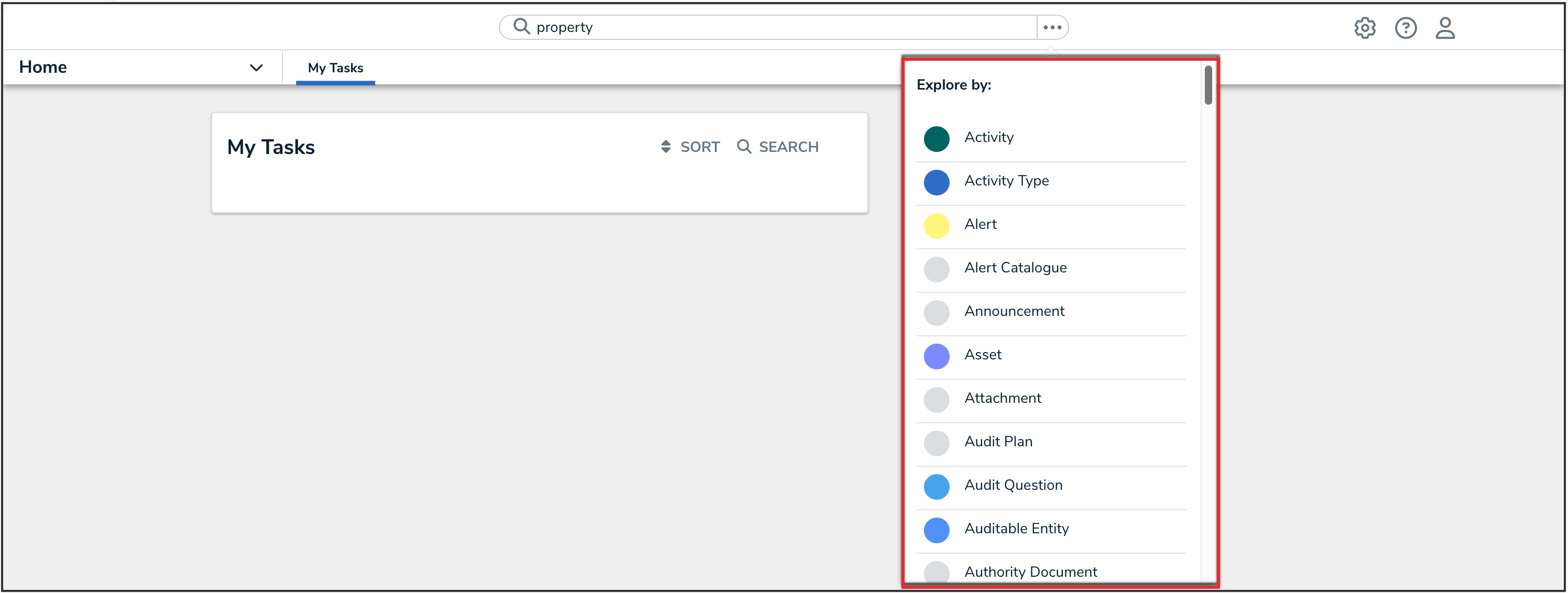 - From any screen in Resolver, type the name of an object into the Search Bar in the nav bar and click the Explore By icon to display the list of object types.