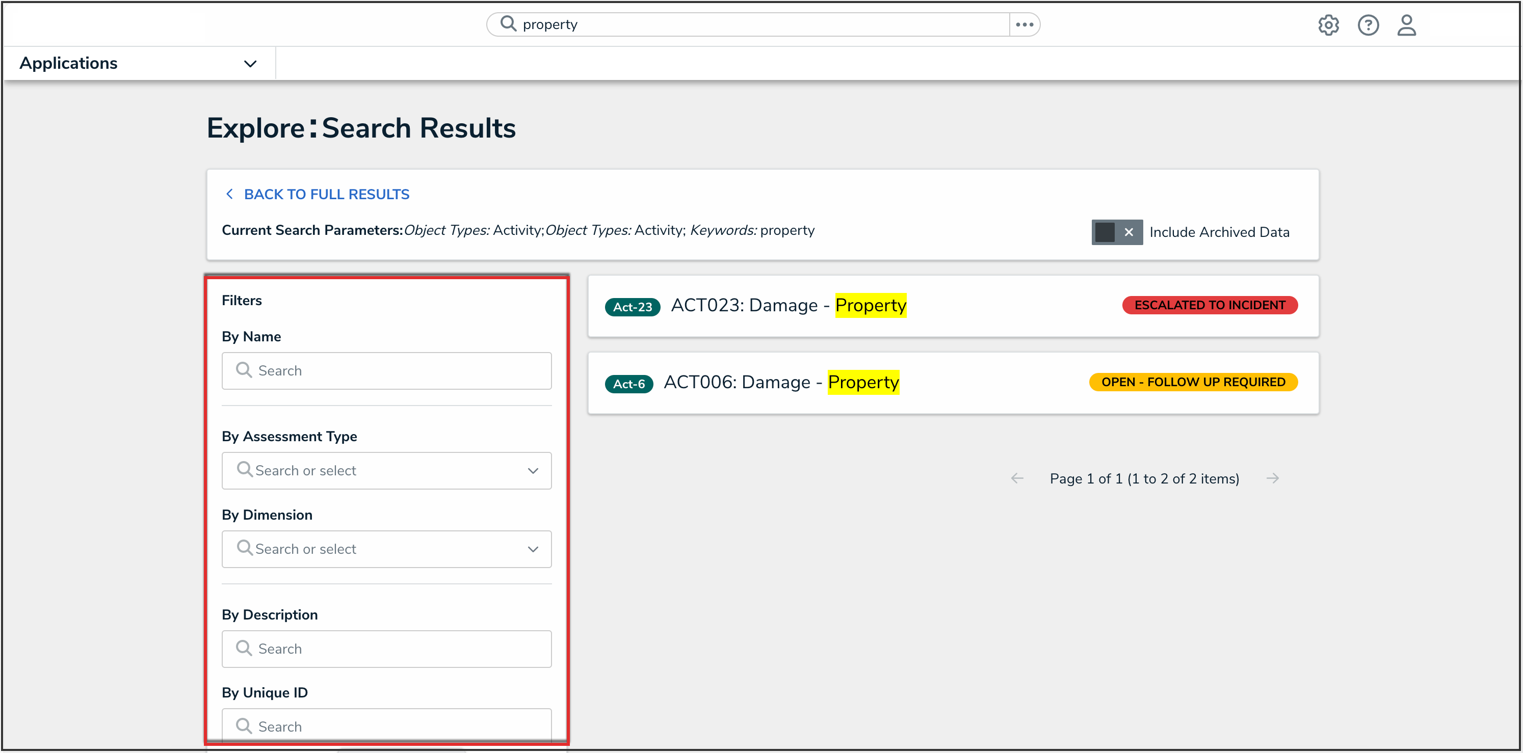 - To include archived data in the search results, click the Include Archived Data toggle to turn it on. If this option is not visible, an administrator has disabled this option for your role.