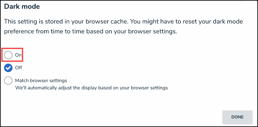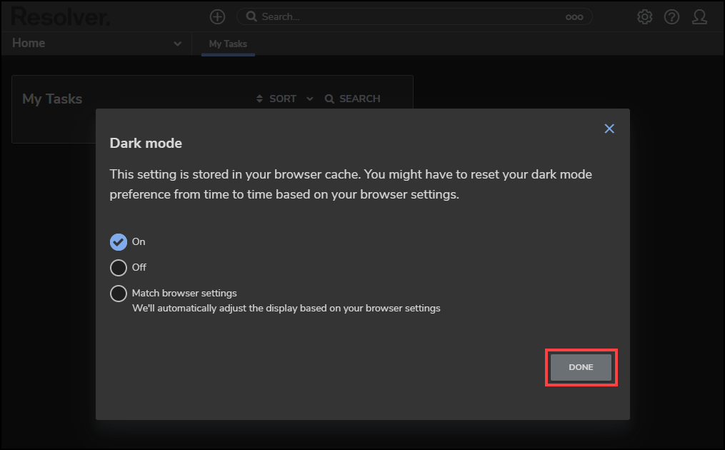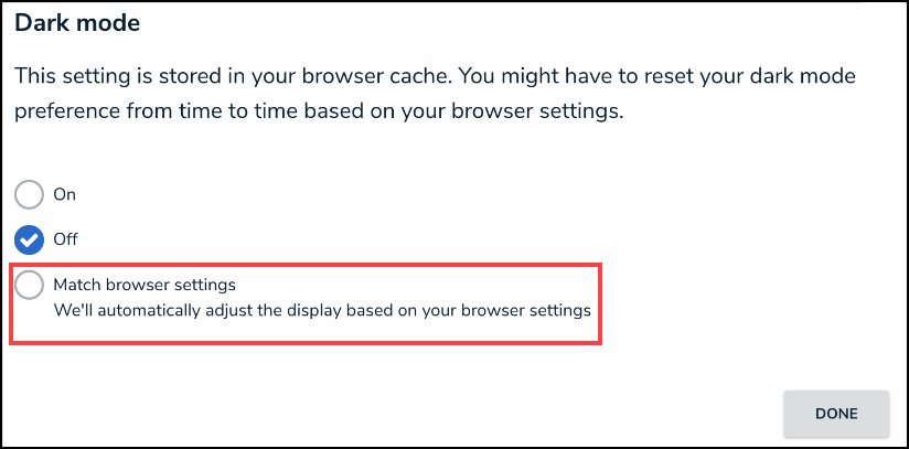 - Click the Match browser settings radio button to use the browser's visual settings to determine the Light or Dark Mode setting for Resolver.
