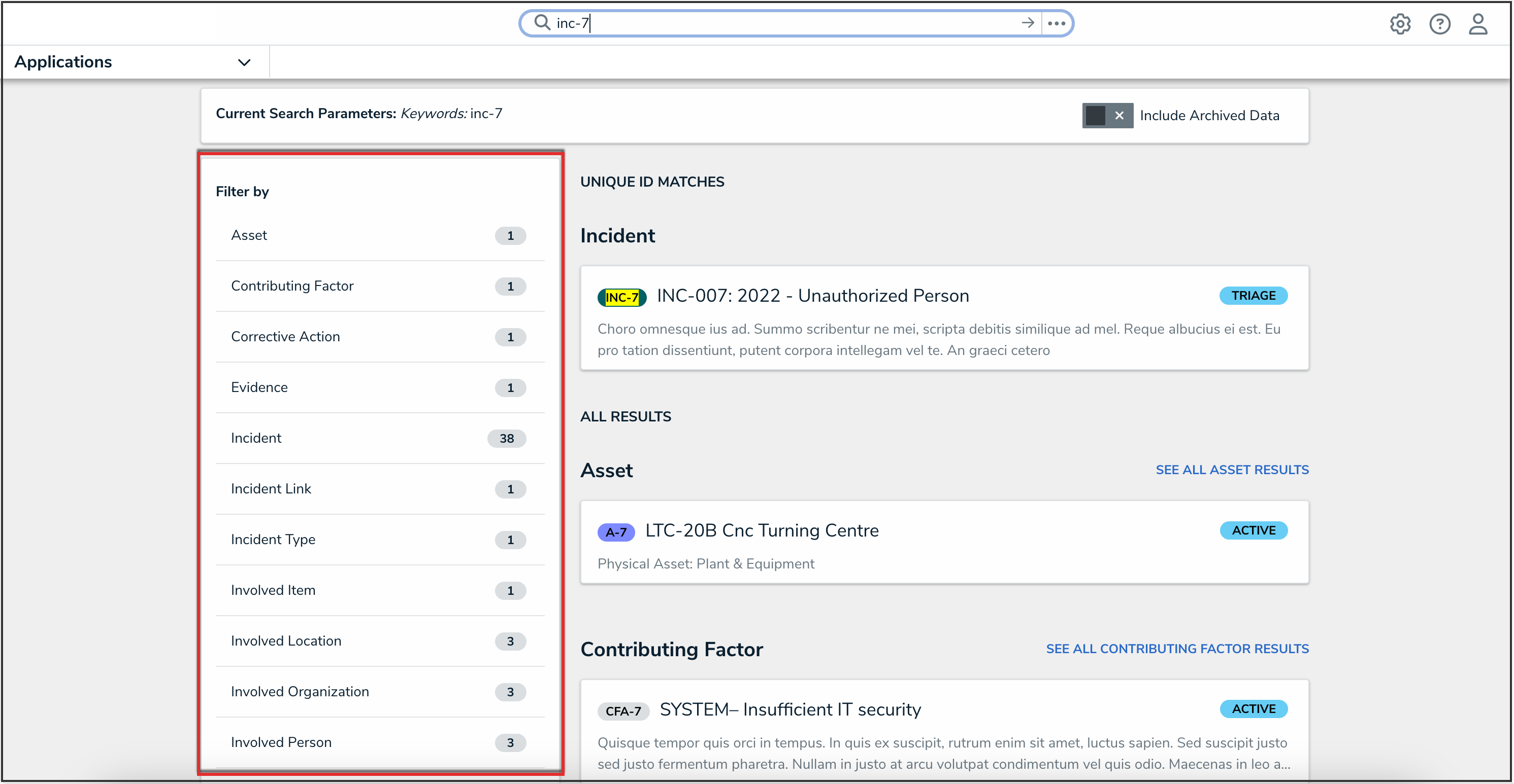 When users search for a unique ID and include the monogram (for example, INC-7) the search results will display an exact match for the unique ID at the top of the results under the Unique ID Matches section. All other results will be displayed under the All Results section.