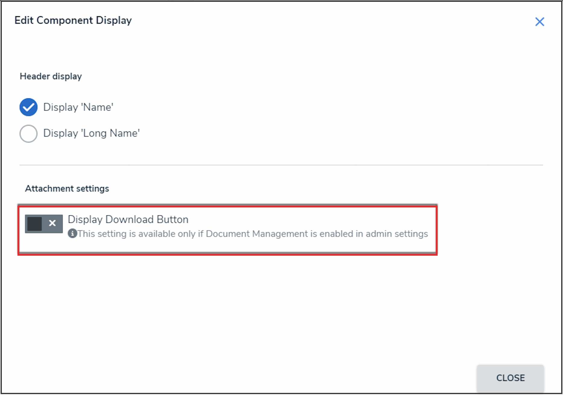 Administrators can now manage whether an attachment can be downloaded or not with a new Display Download Button toggle for attachment fields in a configuration form. When the Display Download Button toggle is turned off, the option to download the attachment will be disabled.