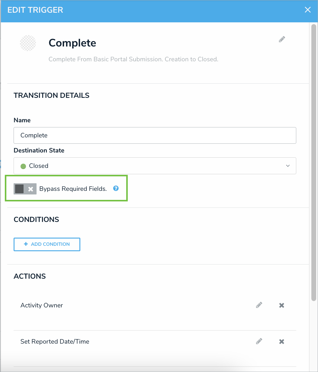 - Admins can now configure transitions to bypass required fields via the Bypass Required Fields toggle on the Workflow Transitions Trigger pallet. For example, an admin wants to run nightly triggers without requiring a workflow change. Or when a response team must view a new object submitter email, but it was missing required form info and didn’t transition. These annoying hurdles won’t prevent you from getting your work done anymore, because of the new automated Bypass Required Fields Toggle.