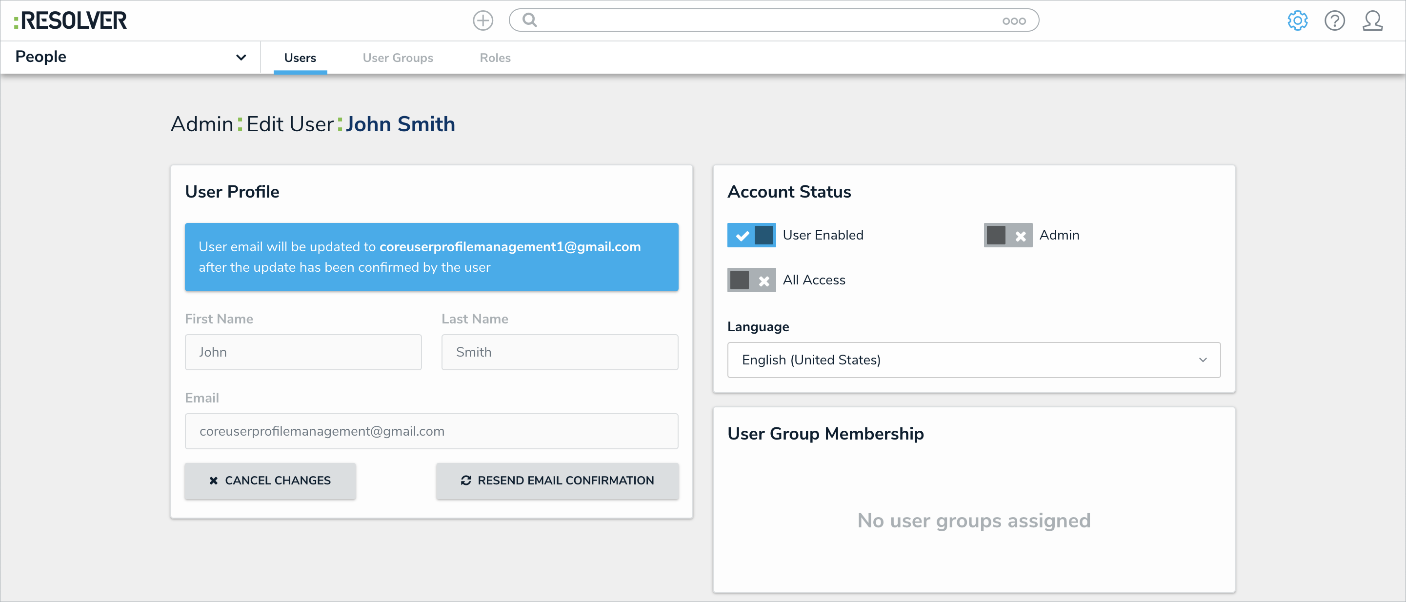 - Resolver administrators (“admins”) can now independently edit a user’s first name, last name, and email address within the system. For example, when an error is identified, or someone changes their name, an admin can make those user profile updates without contacting support.