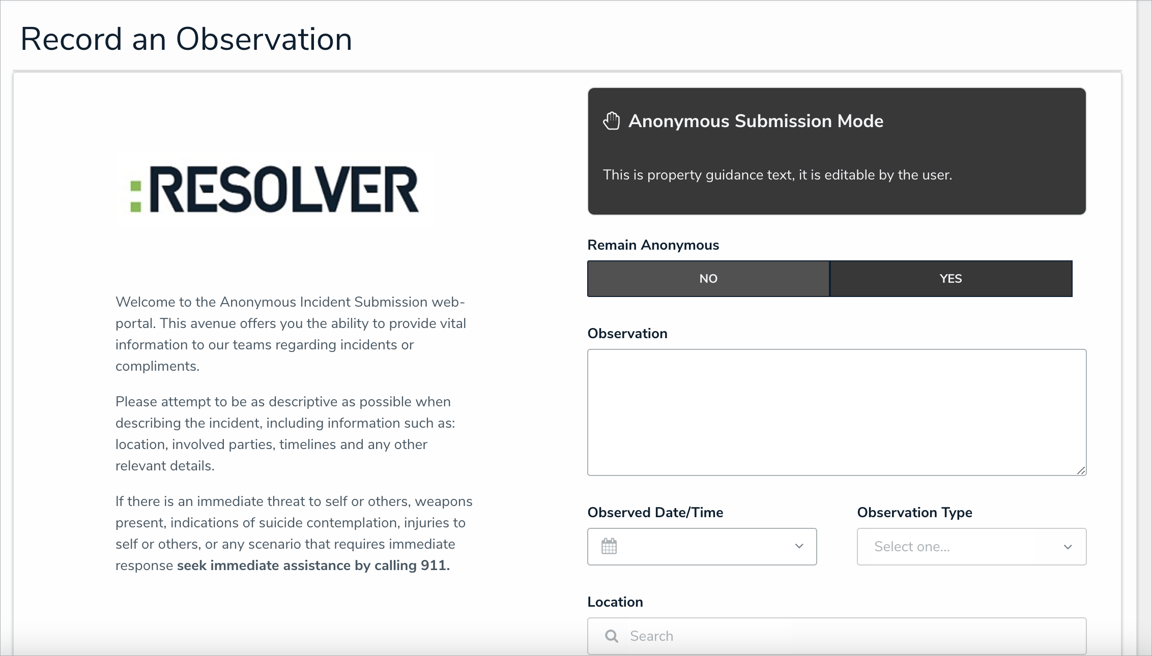 - A new Submitter Property type supports Anonymous Portal form submissions, so incident reporters can choose to hide their identities. For example, an incident submitter can report inappropriate workplace behavior without potential backlash, because Resolver generates an alias via a unique object ID through the portal.