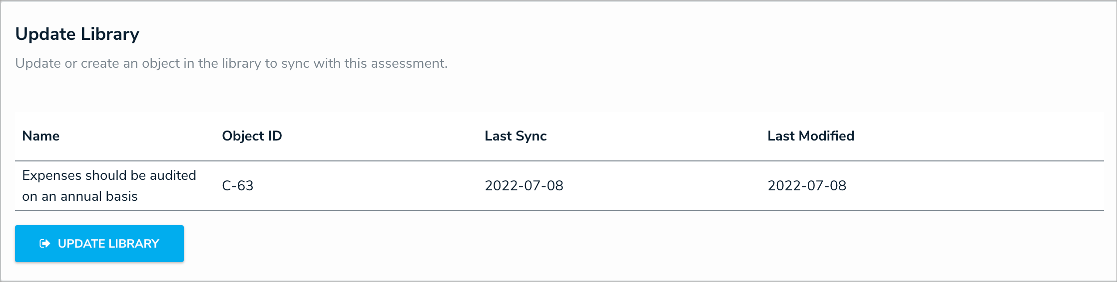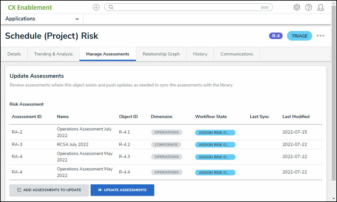 - The Update Assessment button on the new Manage Assessments tab will allow users to push updates to object relationships where a parent-child relationship does not exist in the library. The system will update all object clones instead.