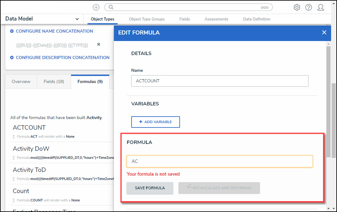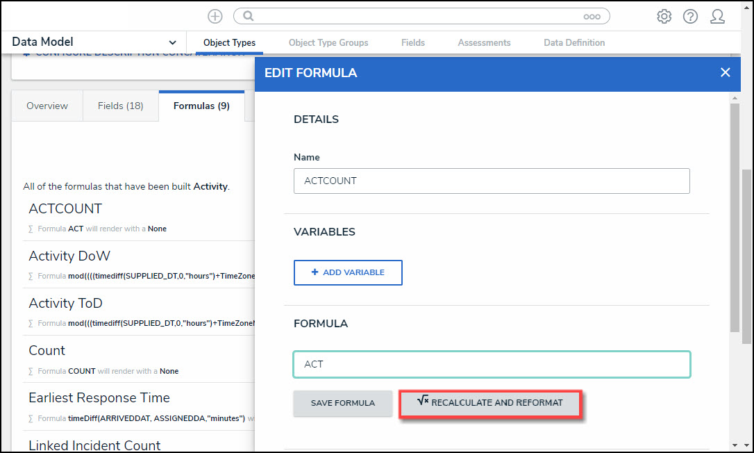 - The Recalculate Formula button on the Edit Formula pop-up (accessed by selecting the Formula tab on the Edit Object Type screen) was renamed to Recalculate & Reformat. The button logic will exclude formulas that have not been edited from the processing queue.