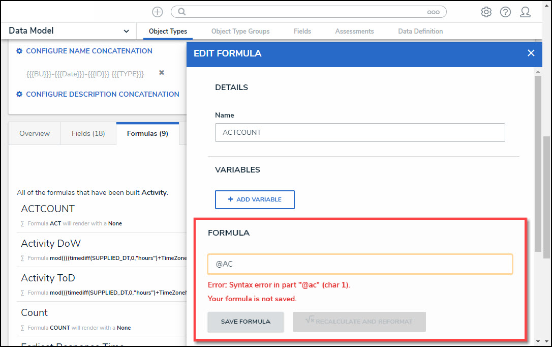 - When you select the Save Formula button on the Edit Formulas or Edit Triggers pop-up, the system will perform a Syntax Validation on the formula to prevent users from saving invalid formula expressions, which can negatively impact APIs.