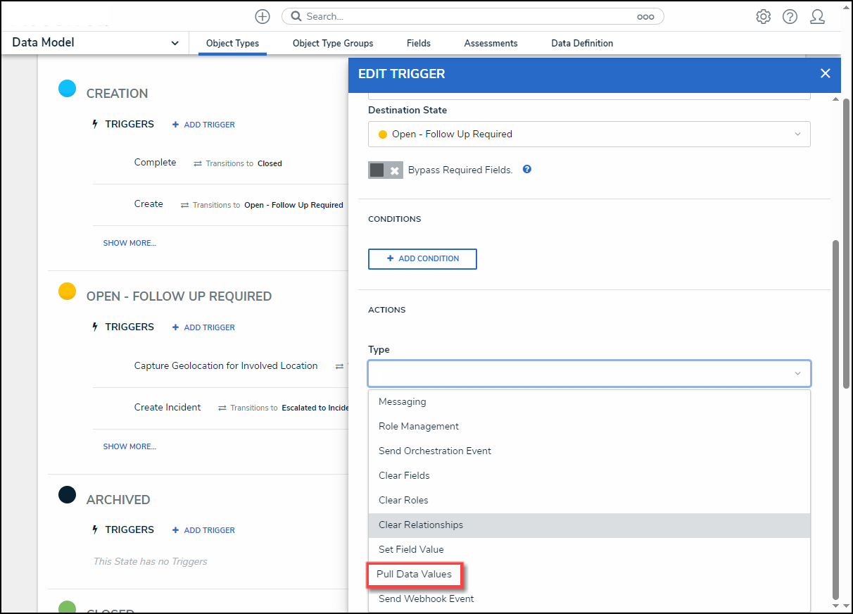 Users can add context to an Object using the Pull Data Values option on the Type dropdown menu on the Edit Trigger pop-up within a Workflow Trigger, using a relationship or reference.