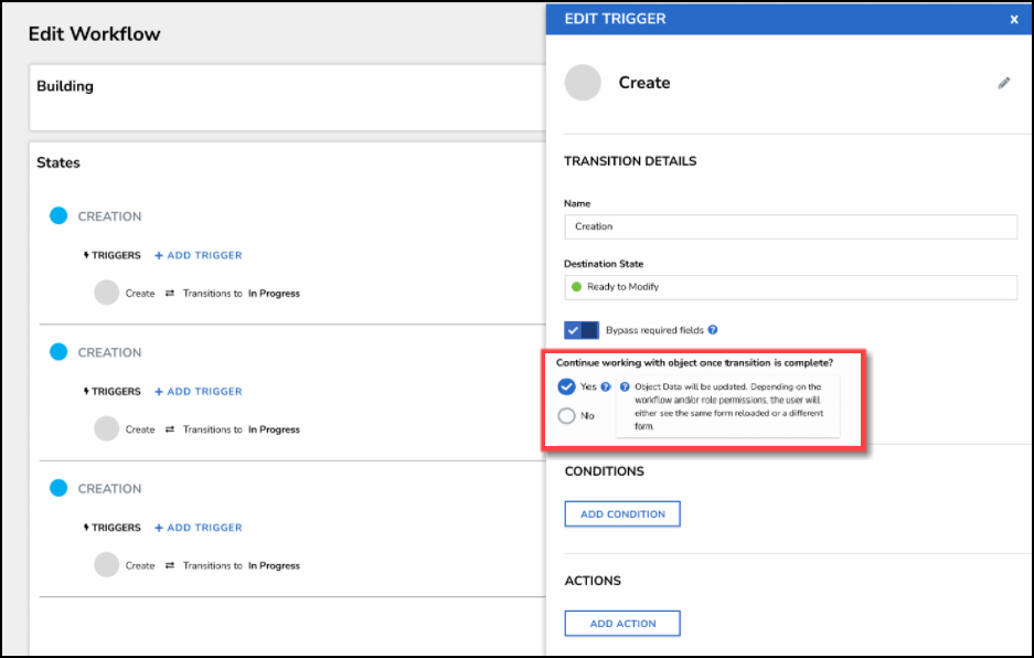 Note: The Continue working with object once transition is complete? radio buttons will not appear on the Create state. |