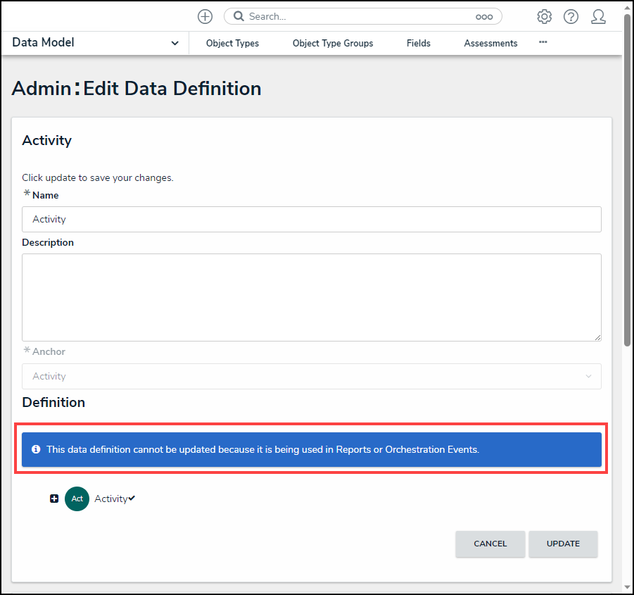 Users can now add additional elements to a Data Definition if it is not currently used by one of the following Assessment, Navigation Forms, Reports, Orchestration Event Actions, or Value Concatenations. System-generated messages will now indicate when additional elements can be added and when a Data Definition is used. For more information, please see the Adding New Elements to a Data Definition article.