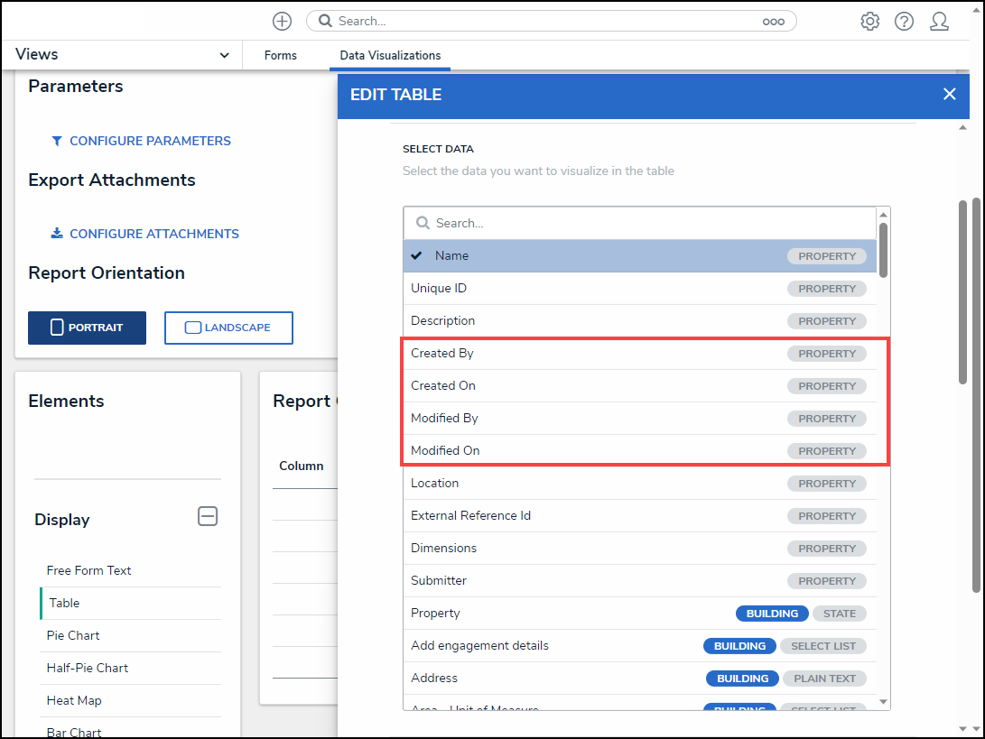 Users can add Created On, Create By, Modified On, and Modified By data-to-Data Visualization Tables from the Edit Table pop-up.