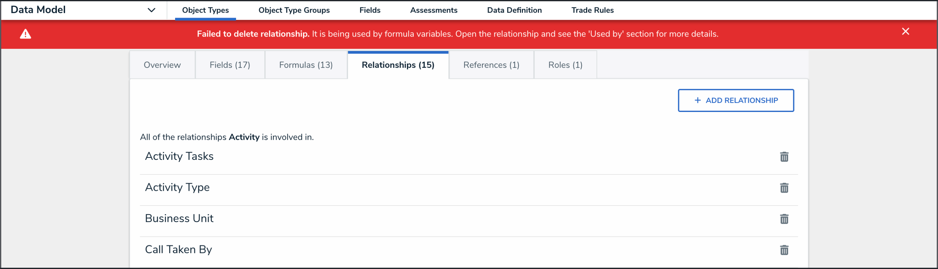 Relationships that are referenced by regular or n-depth formula variables can no longer be deleted. This includes deleting the relationship or reference from an object type, and deleting the object type group that is linked to the relationship or reference. If a user attempts to delete a relationship that is used by a formula variable, the following error message will display:
