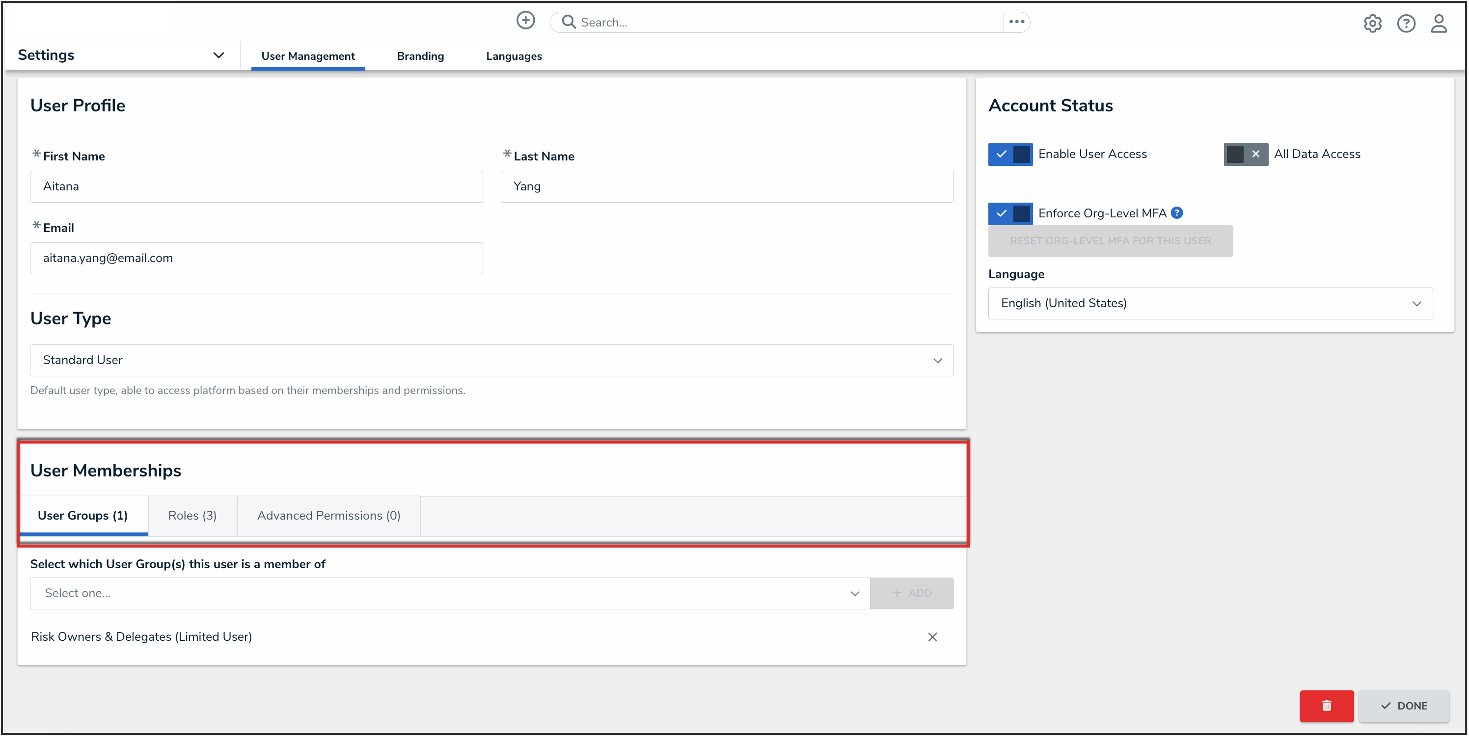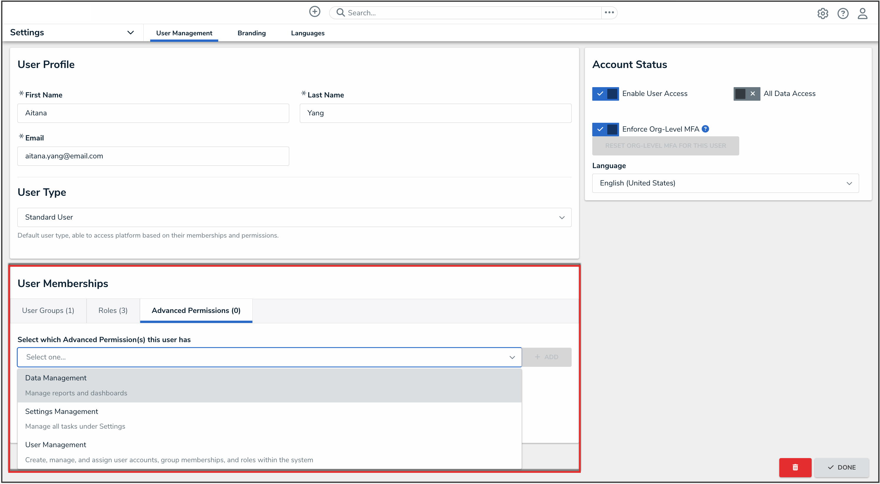 An Advanced Permissions tab has been added to the User Memberships card. This replaces the Advanced Permissions card. In this tab, Administrators and Super Admins can choose the following permission from a new drop-down menu: