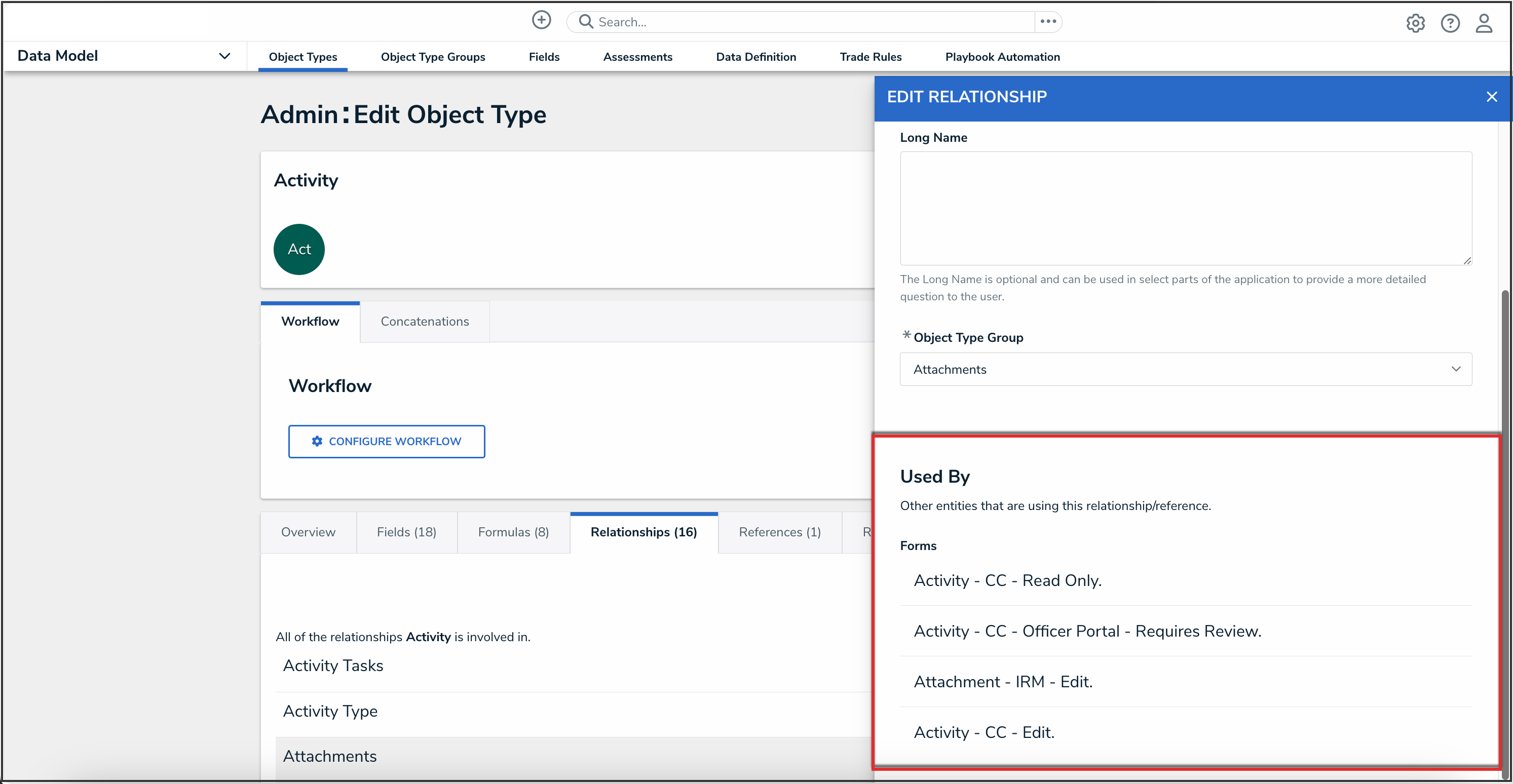 Additionally, a Used By section has been added to the Relationship palette. This lists which dashboard data sets, data definitions, forms (excluding relationships within a relationship table), formula variables, playbook automations, reports, and workflow actions use the relationship.