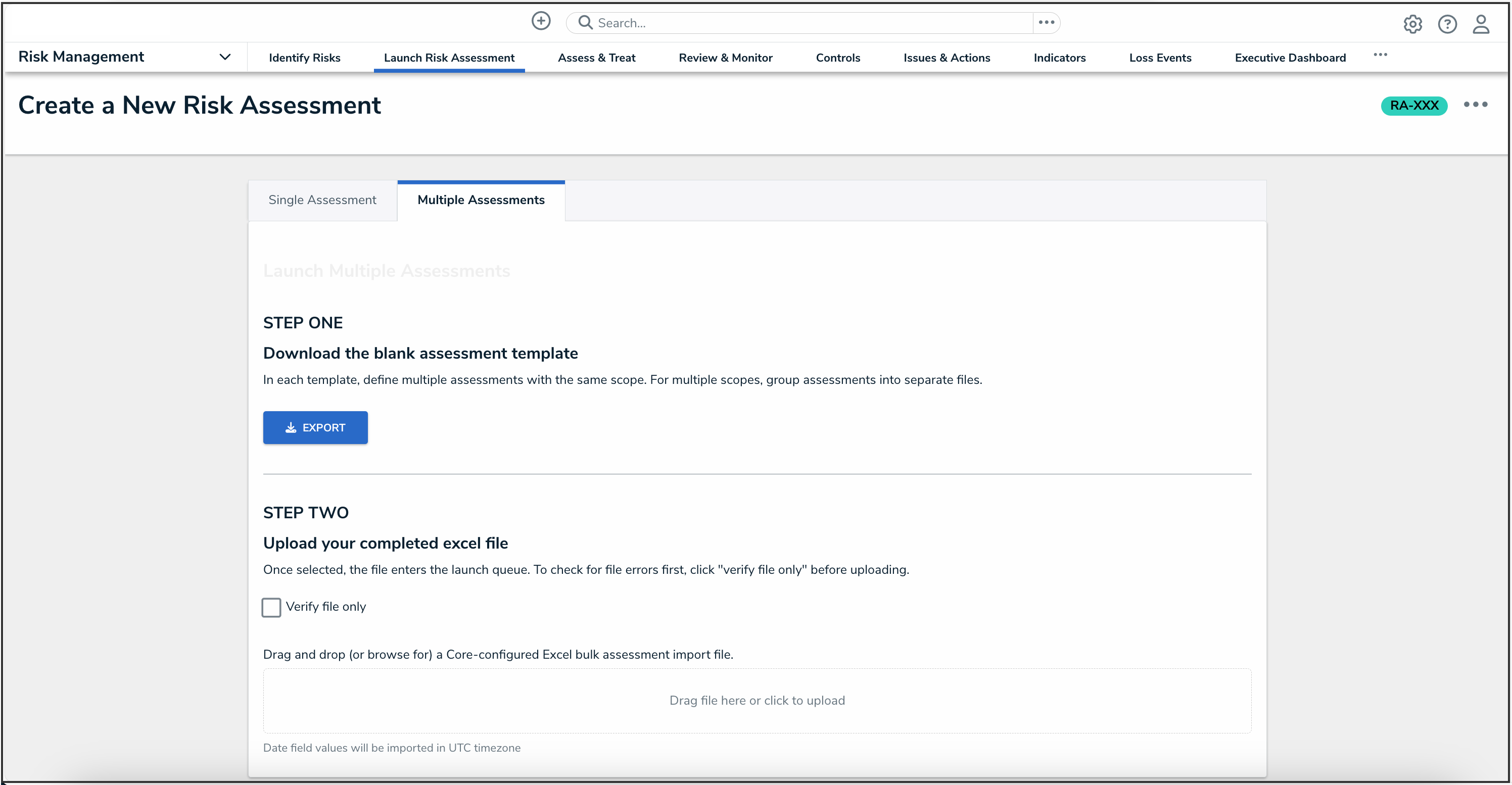 Bulk assessment launch allows users to launch multiple assessments of the same type and scope concurrently. Users will be able to export a template Excel file, fill in the details of the assessments, and import the completed template to initiate the bulk assessment launch.