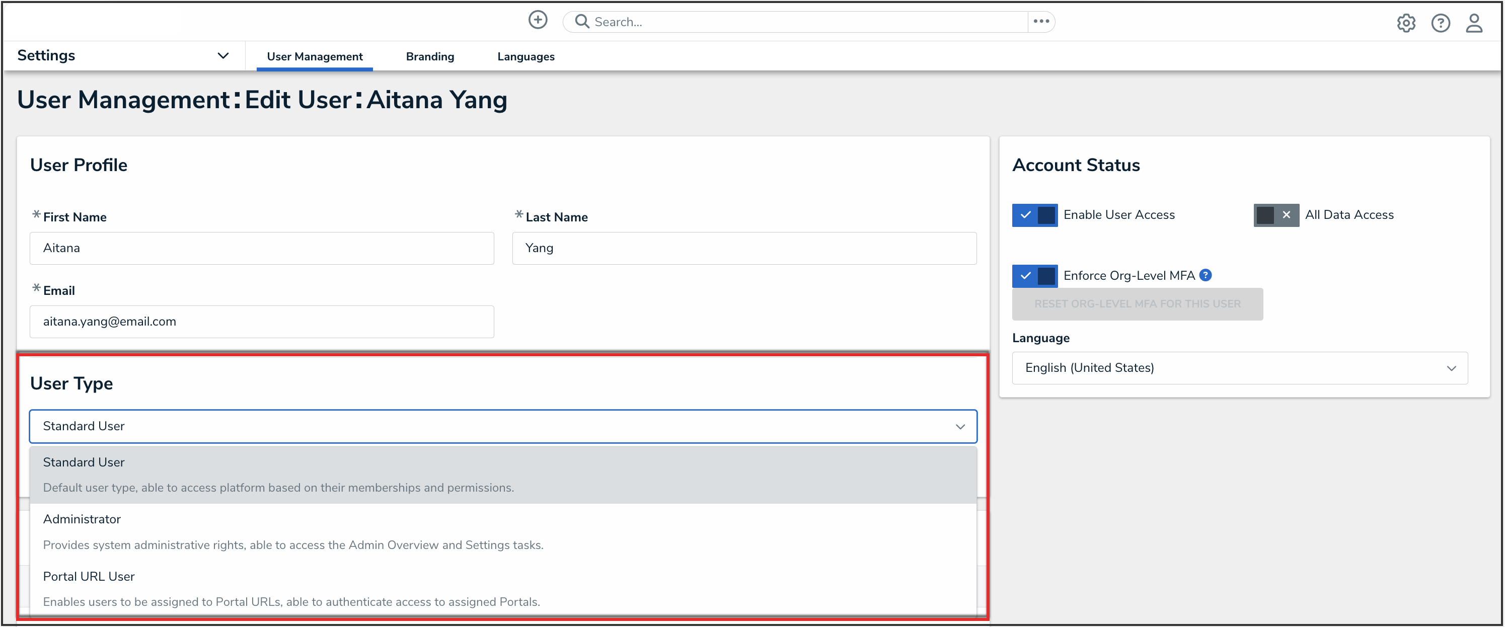 A new User Type drop-down menu has been introduced that replaces the default user and Admin and Portal URL Access toggles in the Account Status section. The three different user types are as follows: