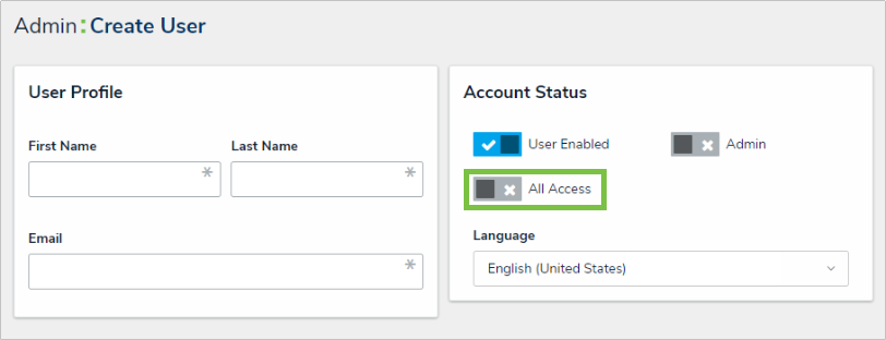 User accounts also have an All Access setting, which is usually reserved for administrators only. If All Access is enabled, the user will have unrestricted access to all objects in the system without needing to assign roles or define permissions. This makes All Access useful for building new applications.