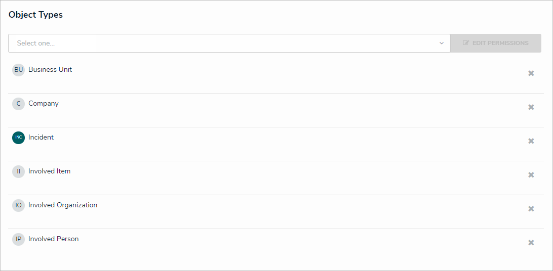 Define the object types members of the role will have access to. The Object Types section on the Edit Role screen.