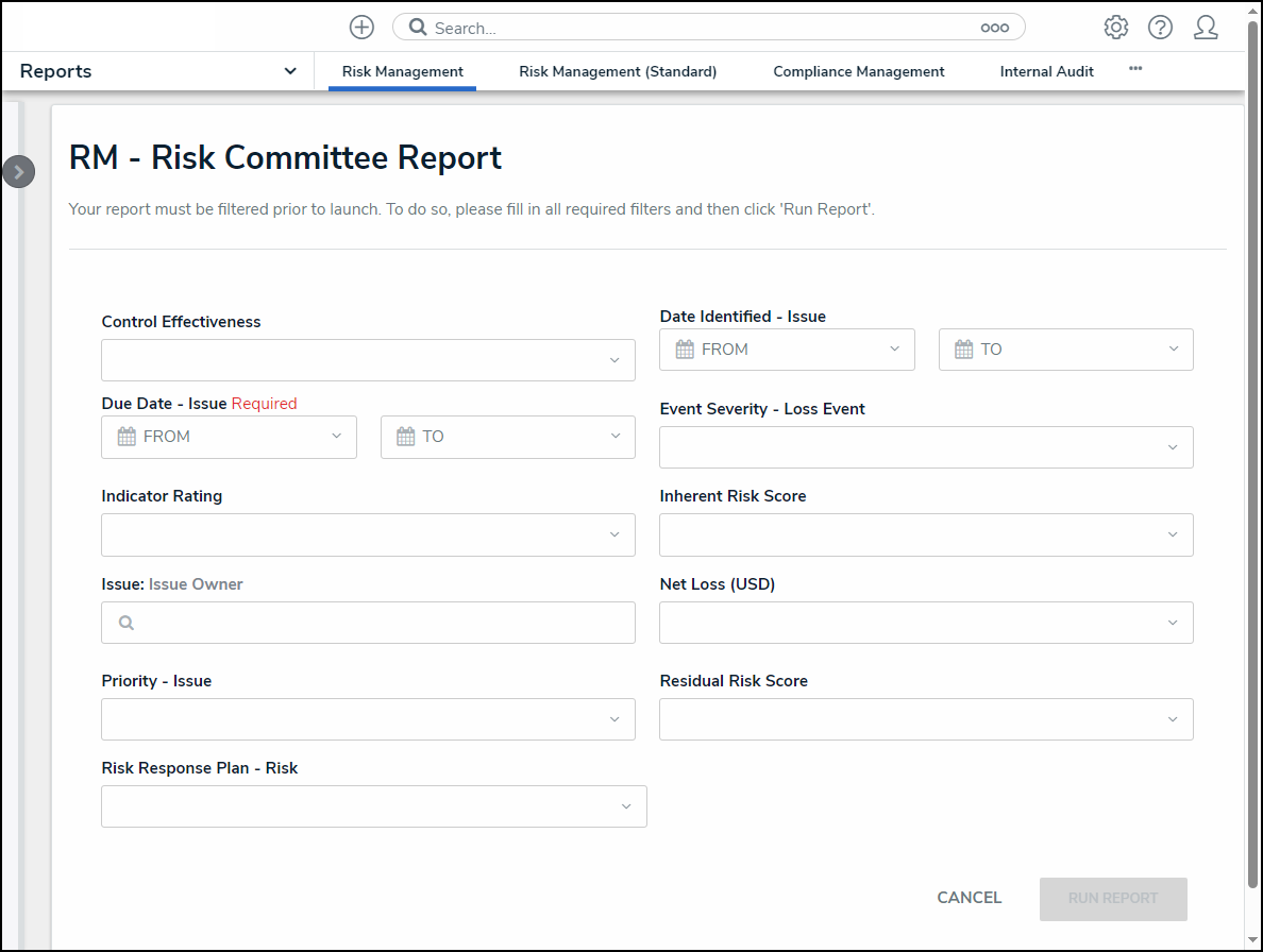 - If a filter is marked as Required by an Administrator during the report creation, a Filter Report screen will appear, asking the user to fill out all required filters.