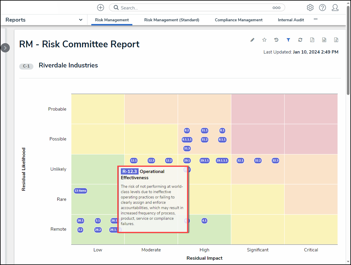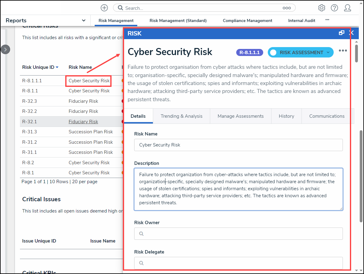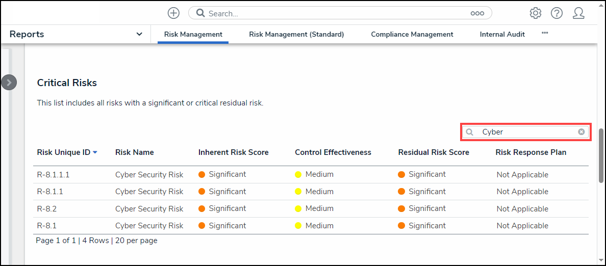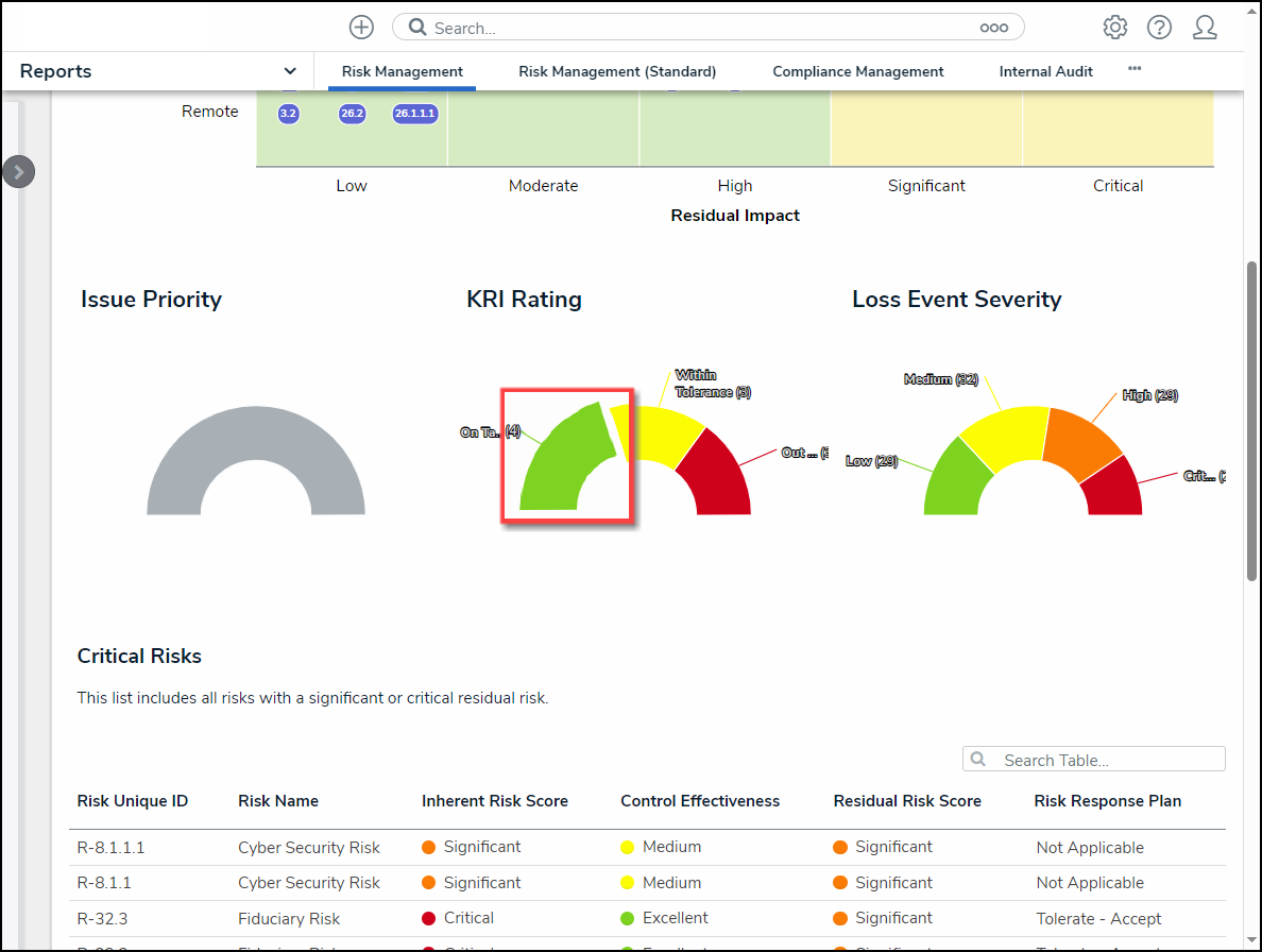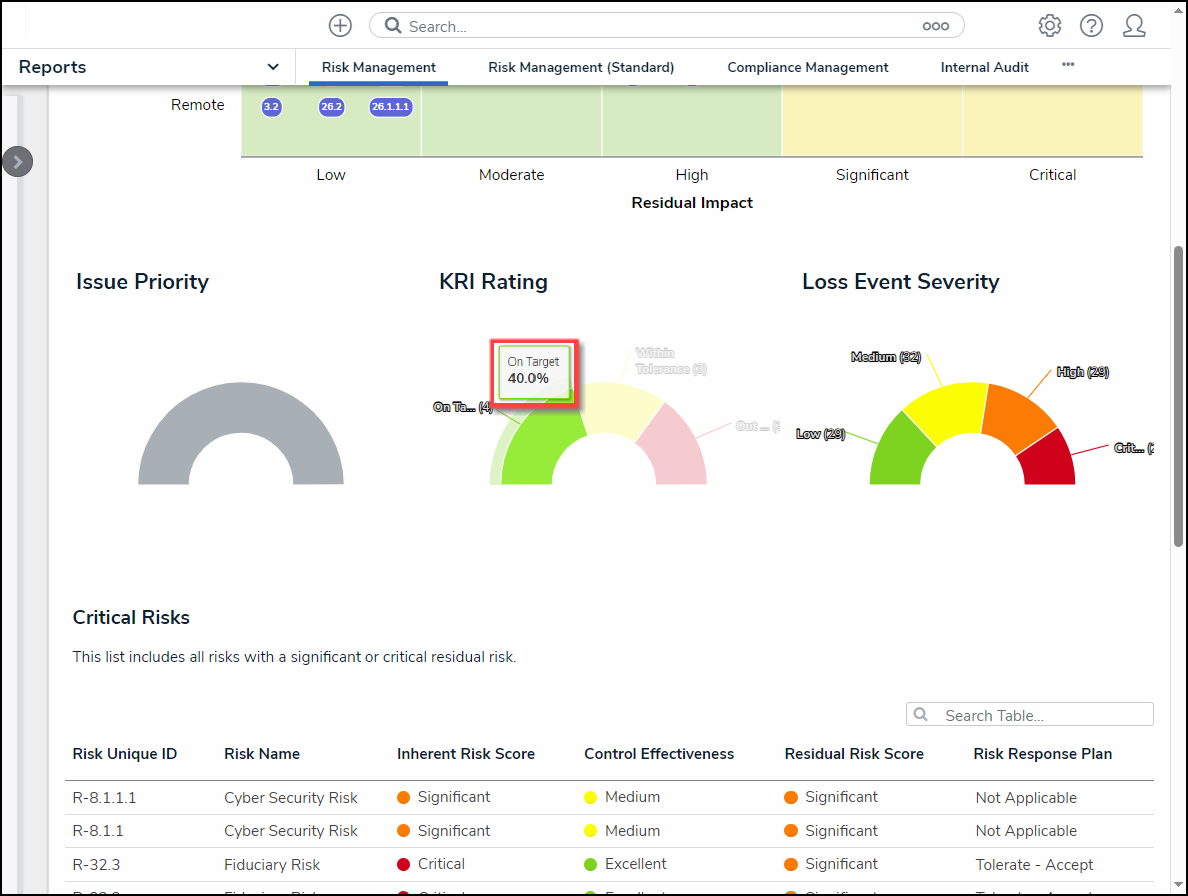 - Relationship/Reference: Allows a user to filter table data by one or more object type relationship or references. For example, selecting the Risk 1 object type in this filter will also display all the Control objects that Risk 1 appears on through a relationship.