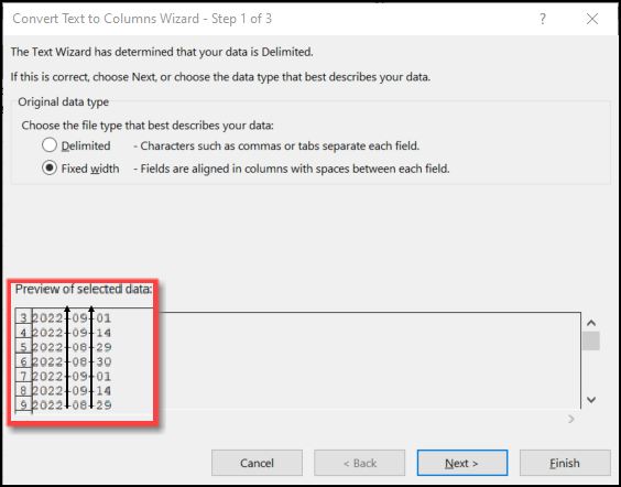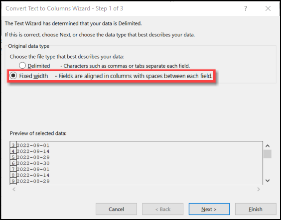 - From the Convert Text to Columns Wizard, select the Fixed width radio button.