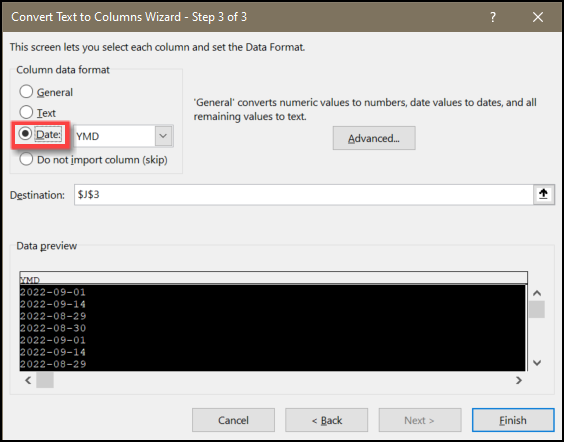 - From the Step 3 Wizard screen, click the Date radio button on the Column date format section.
