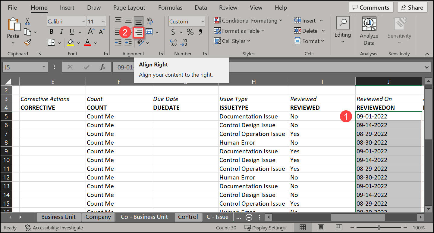 - Make sure that the Date column is right aligned by highlighting the Date column and selecting the Align Right button from the Alignment section on the Home menu.