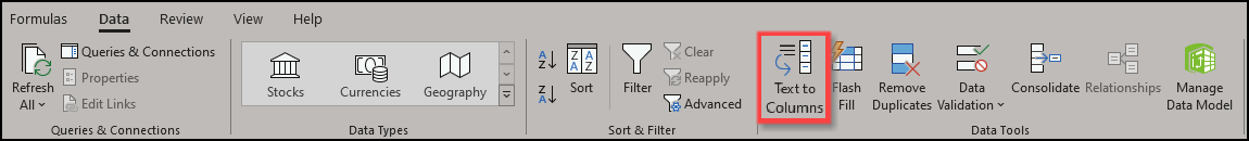 - From the Data ribbon, select the Text to Columns button.