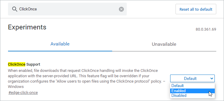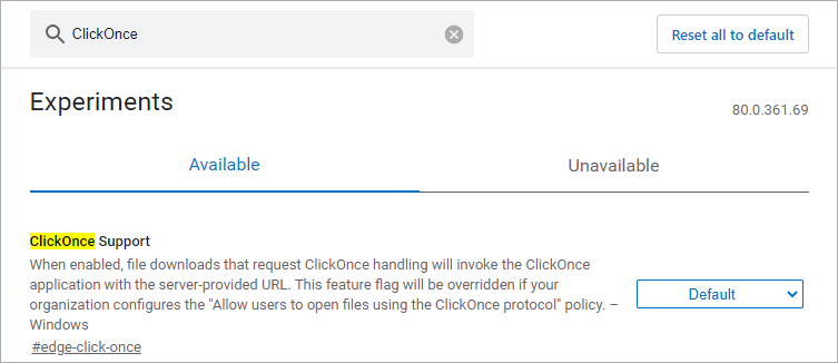 - Begin typing ClickOnce Support in the search bar to display ClickOnce Support in the Experiments list.