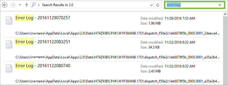 - Enter the phrase error log in the folder search field in the top-right corner of the 2.0 folder, then press Enter on your keyboard.