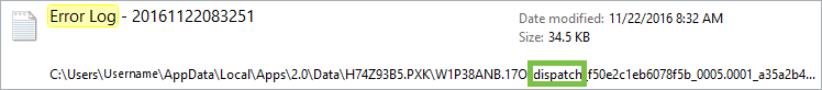 - Locate the applicable log file in the search results. These files are .txt documents with a timestamp indicating when the application was launched. To determine which application the log belongs to, look for dispatch in the file path.