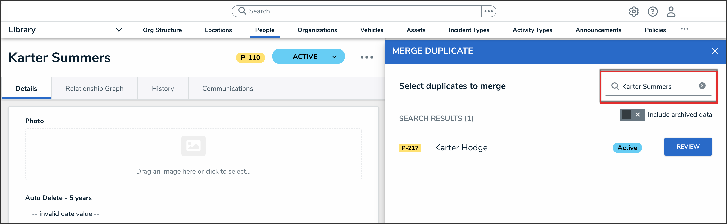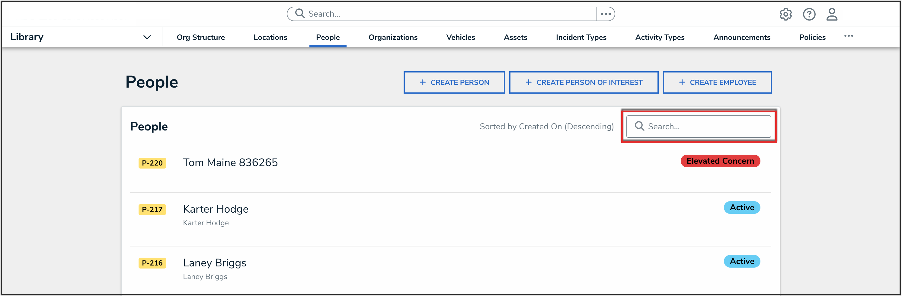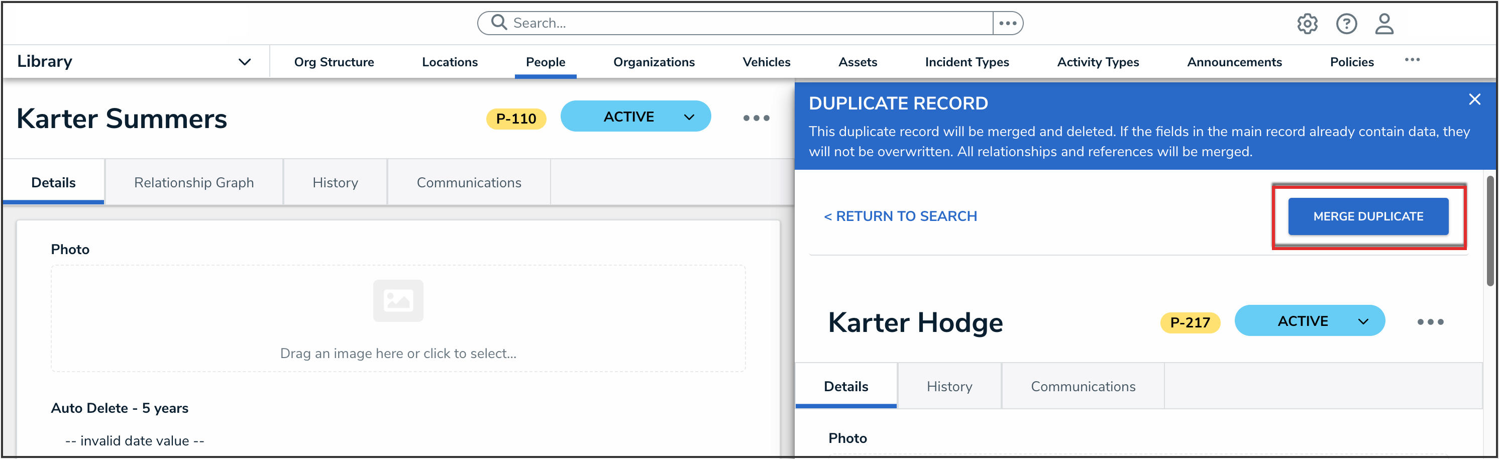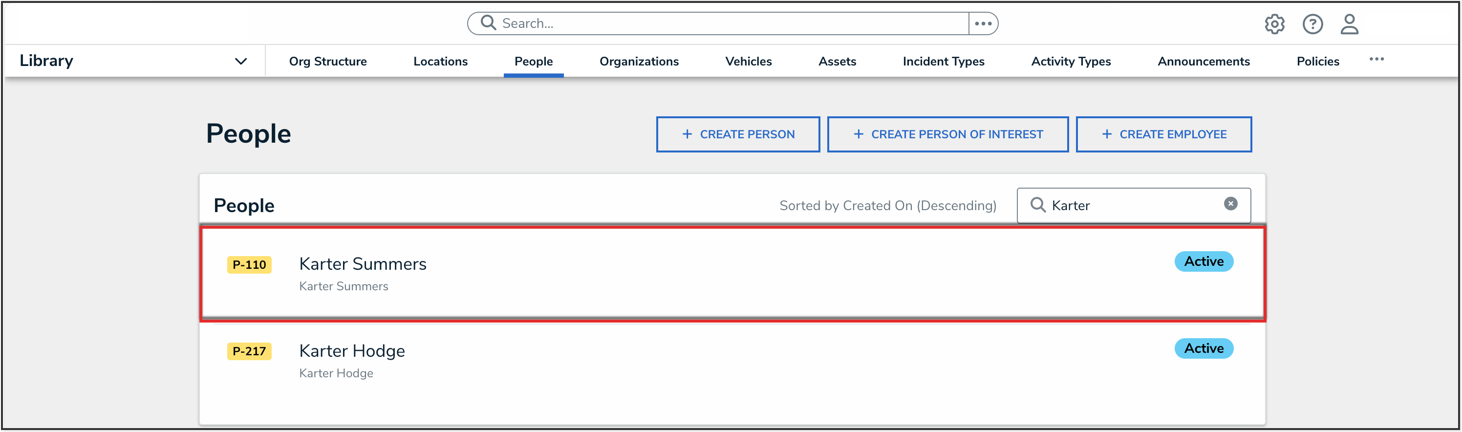 - From the People screen, enter the name of one of the duplicate objects (People) in the Search field to narrow the search results list.