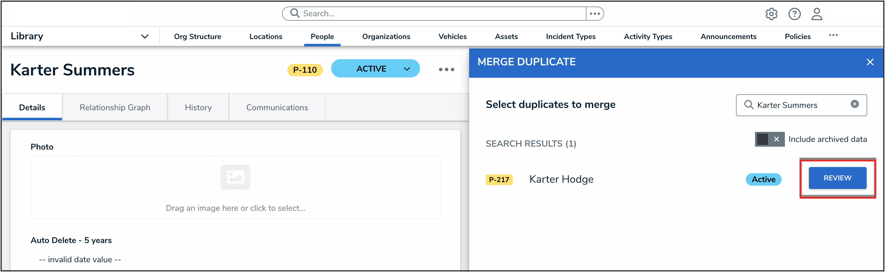 - Click the Review button next to the duplicate object you want to merge into the main object.