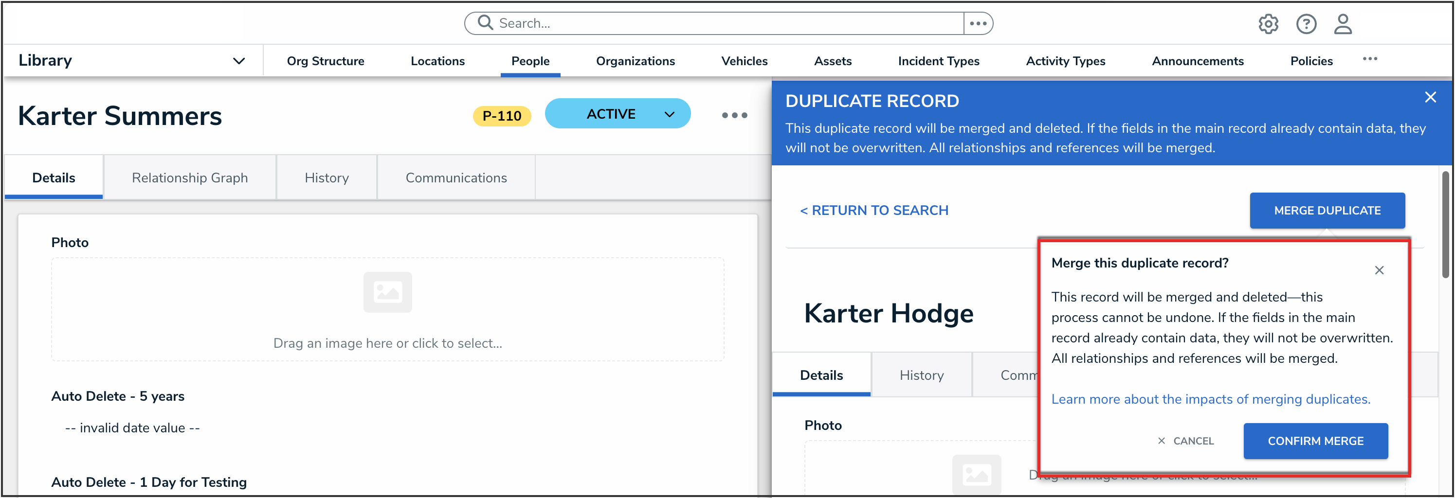 - From the Merge this duplicate record? pop-up, click the Confirm Merge button to merge the duplicate object into the main object and delete the duplicate object from the system.