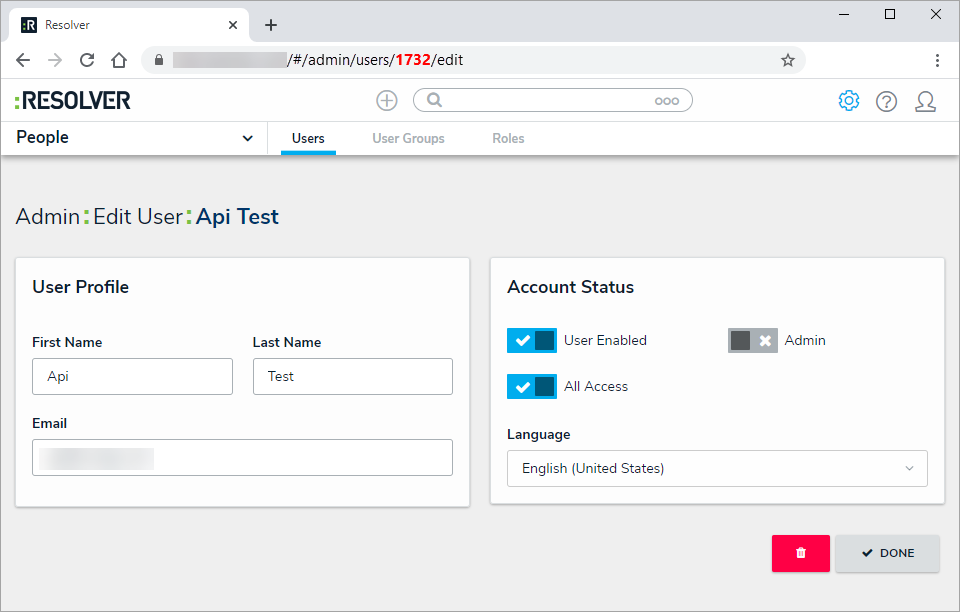 To impersonate a user with an API key, open a supported endpoint in Swagger, enter the API key in the x-api-key field and the ID of the user to be impersonated in the impersonate-user-id field. The user ID can be obtained from the address bar of your browser after navigating to the Edit User page for the user (e.g., 1732).