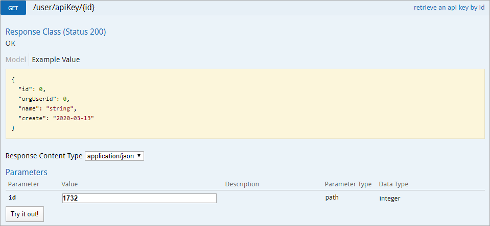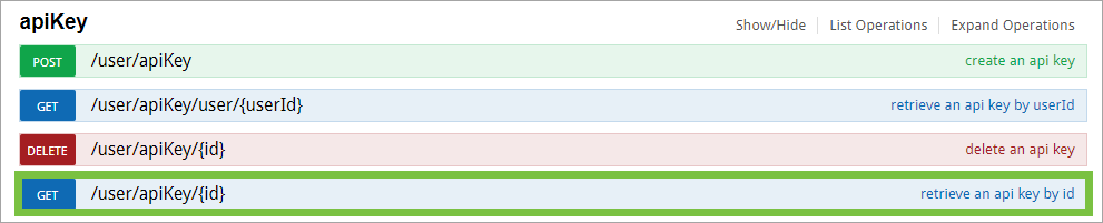 - Click GET /user/apiKey/{id} (retrieve an api key by id) to expand it.