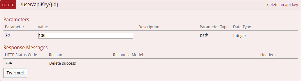 - Click DELETE /user/apiKey/{id} (delete an api key) to expand it.