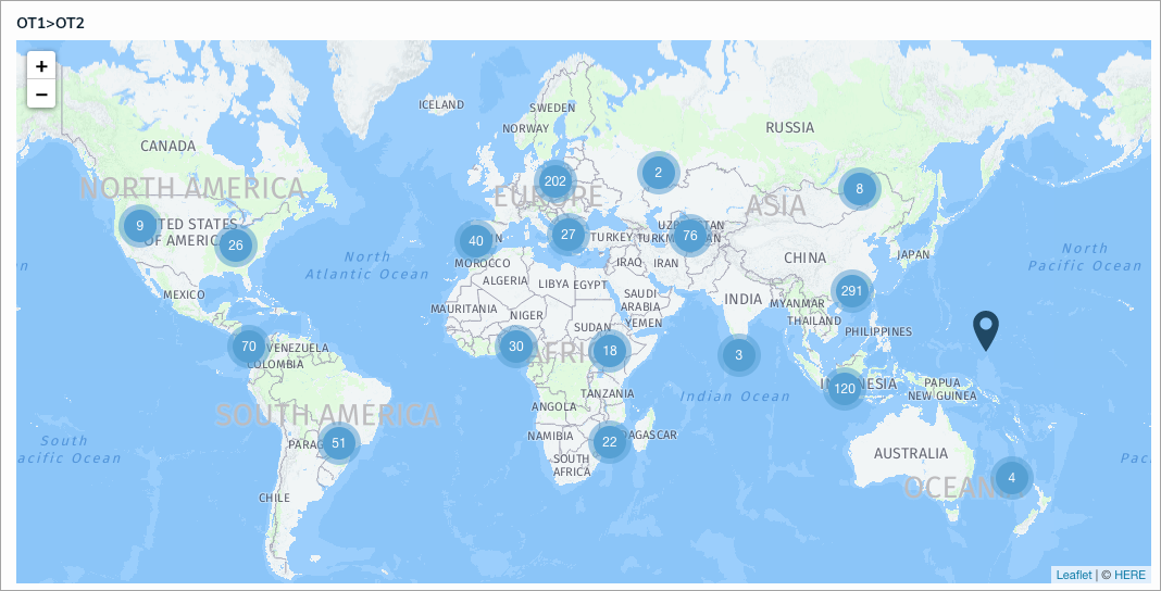 A map displaying pins representing the originating object (light blue) and its relationship objects (dark blue).