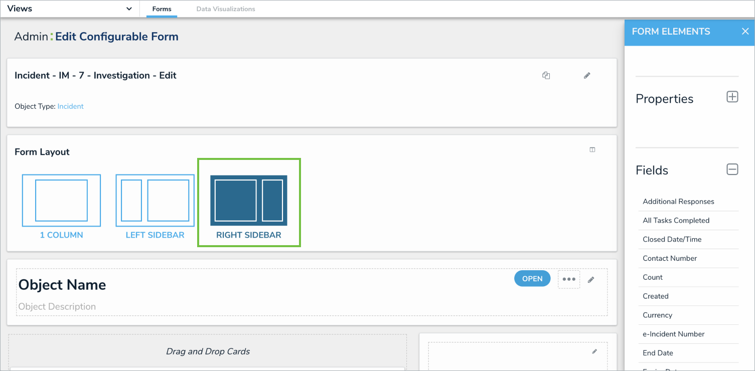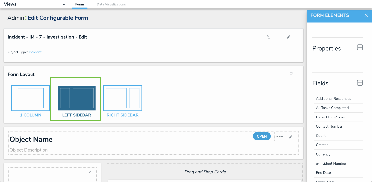 The sidebar option is a form card fixed to the left or right side and enables side-by-side cards for inline form content. Using this layout can also help breakdown long boxes of text, so your forms’ key details (i.e., the main object reference points) are presented in a more accessible way. While the sidebar may not be dragged and moved elsewhere in the form, sections and components within the sidebar can be reordered.