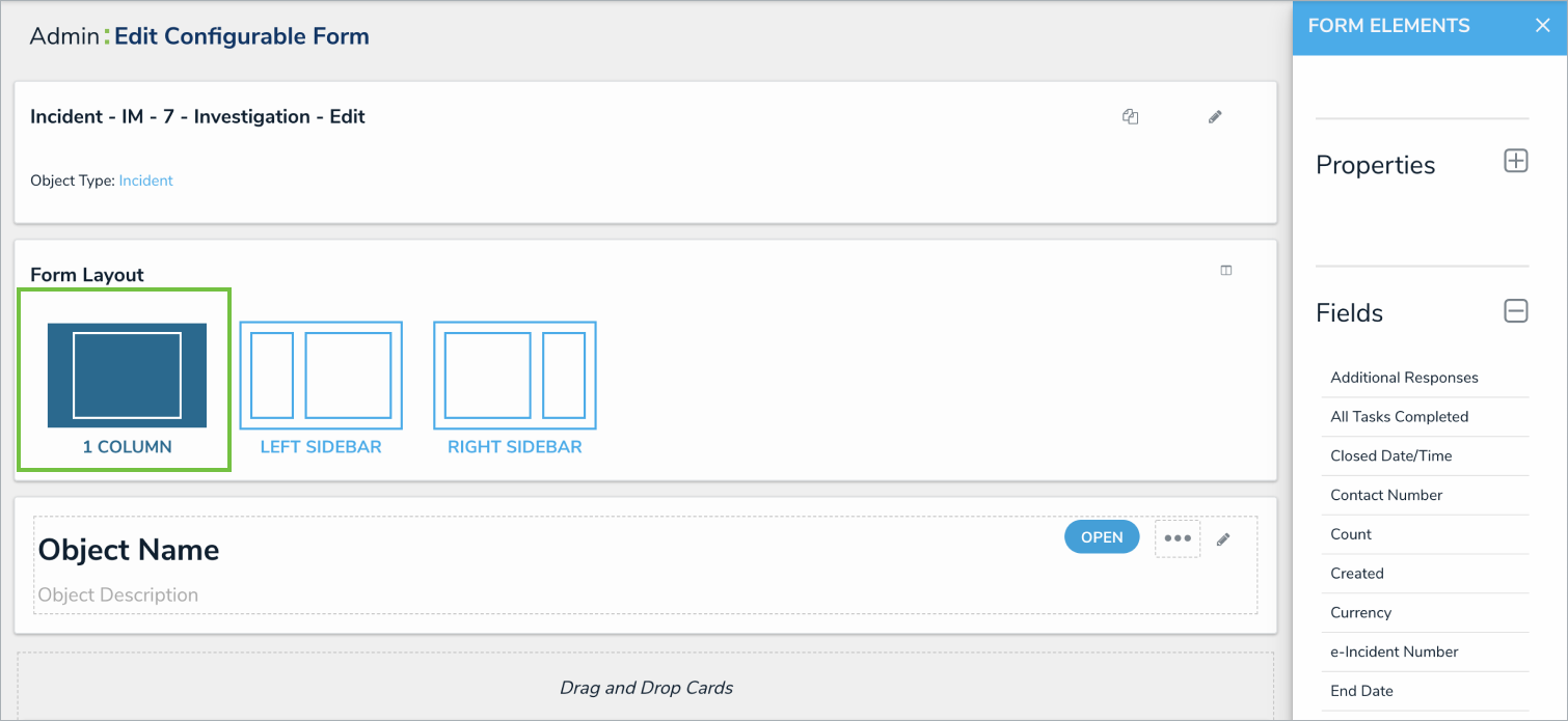 This layout option displays all form cards, sections, and components only in the main form area. With the 1 Column layout, the main form area is a single column (66% screen width), possibly with multiple cards in it, positioned vertically.