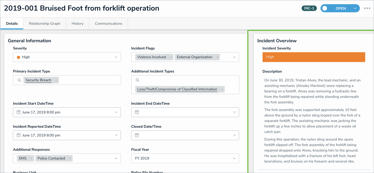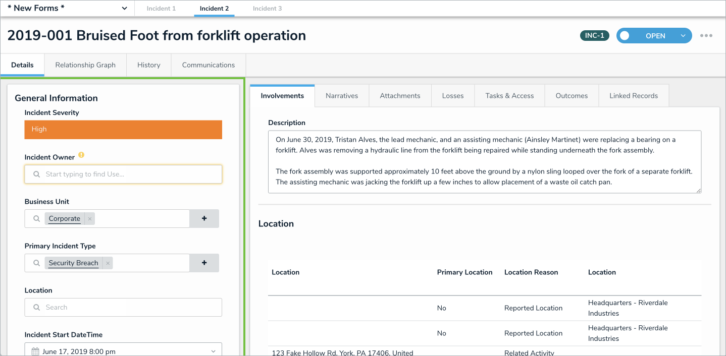This layout separates the form content into a sidebar card on the left and a main form area on the right. In this layout option, the left sidebar should be used for general object information, so the application user has a quick reference on the object, while completing the actions in the main form area on the right. Example forms that use the left sidebar may include Collection types of forms, like Risk or Triage objects.