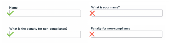 Concise, single-word labels are generally recommended for simple fields. When asking the user to input data to answer a question, that question should be as straightforward and unambiguous as possible. If the question requires some degree of complexity, think about how you would phrase the question if you were speaking to someone face-to-face.