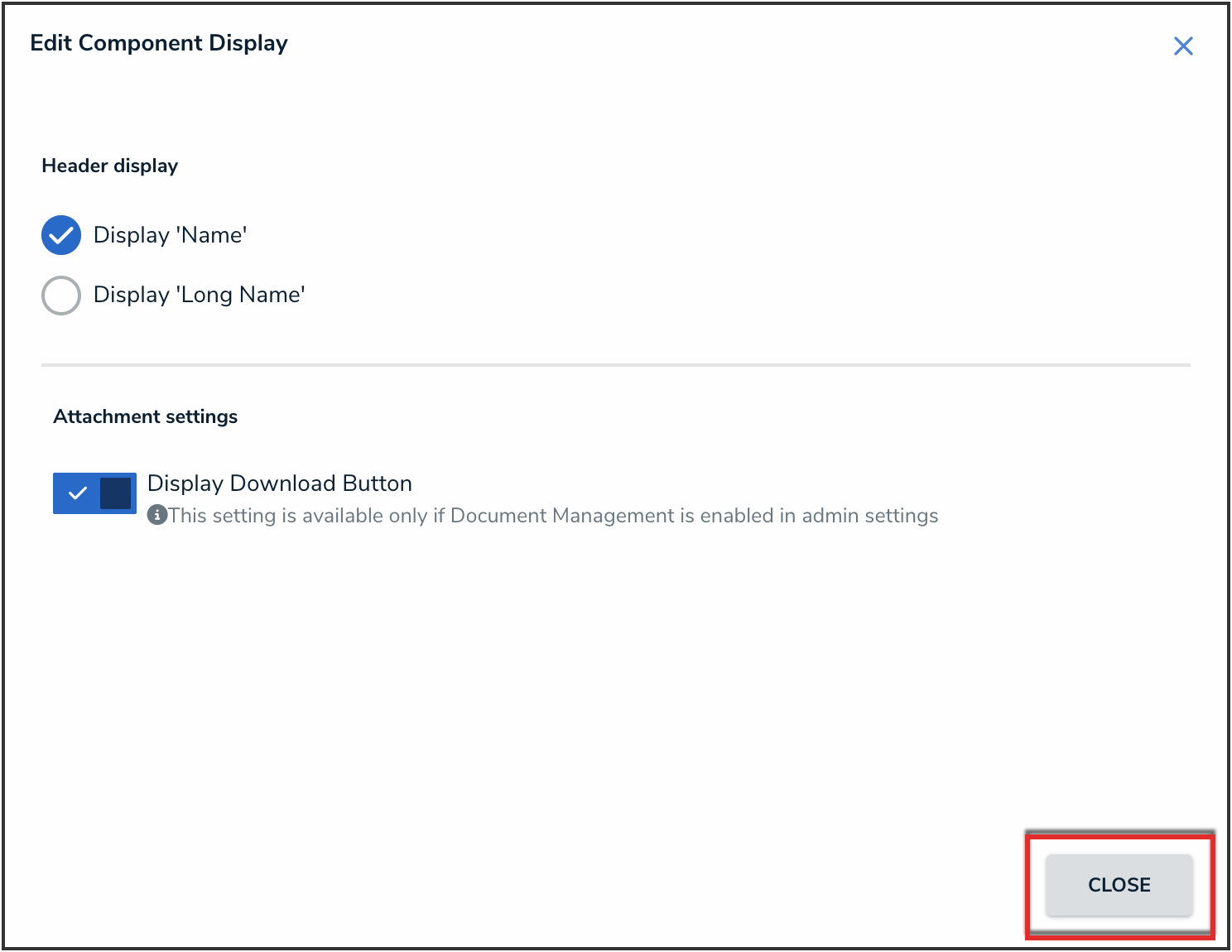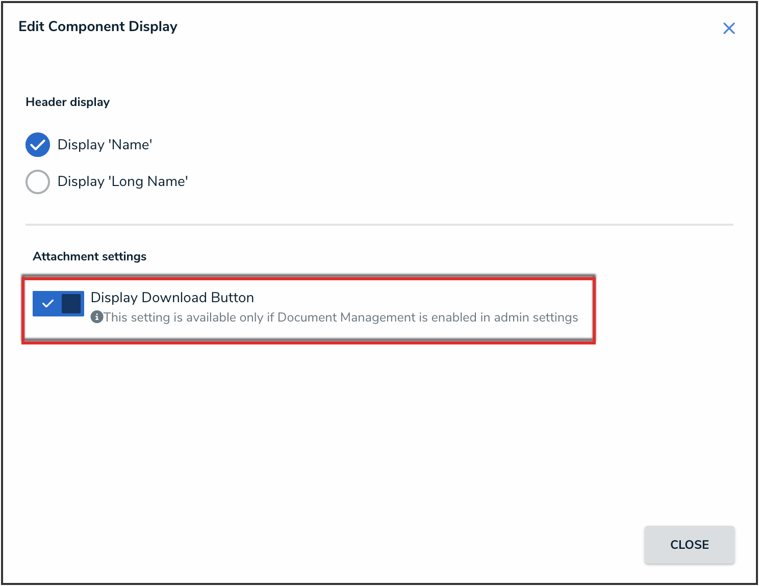 - Click the Display Download Button toggle to turn it on to display the download button on the attachments in that form.