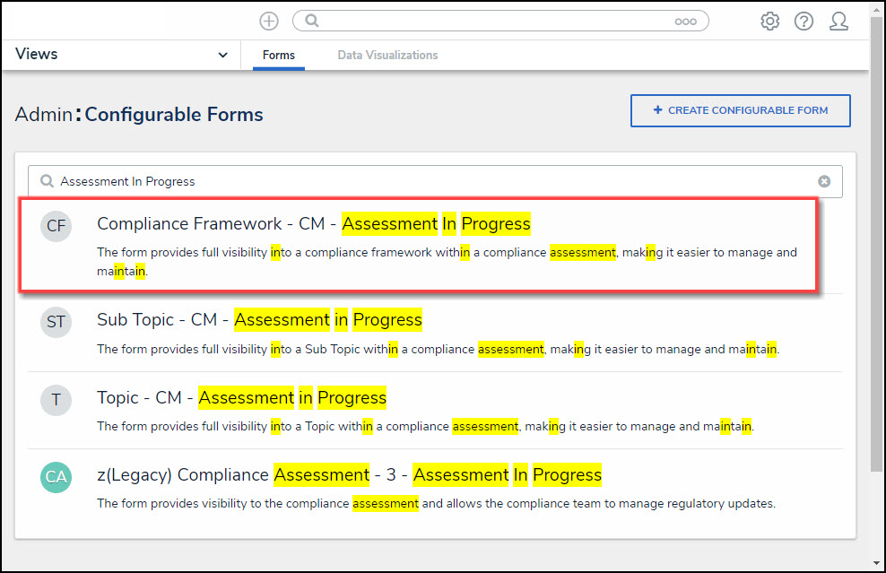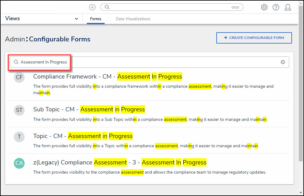 - From the Admin: Configurable Forms screen, enter a keyword in the Search field to narrow down the forms list.