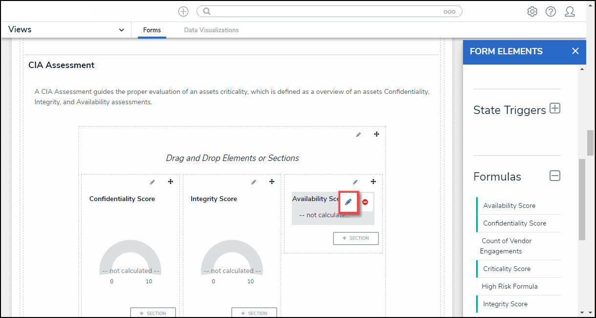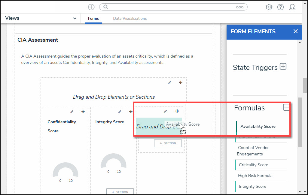 - From the Edit Configurable Forms screen, drag and drop the Field or Formula (e.g., Availability Score) from the Form Elements pop-up to a card or section on the canvas.